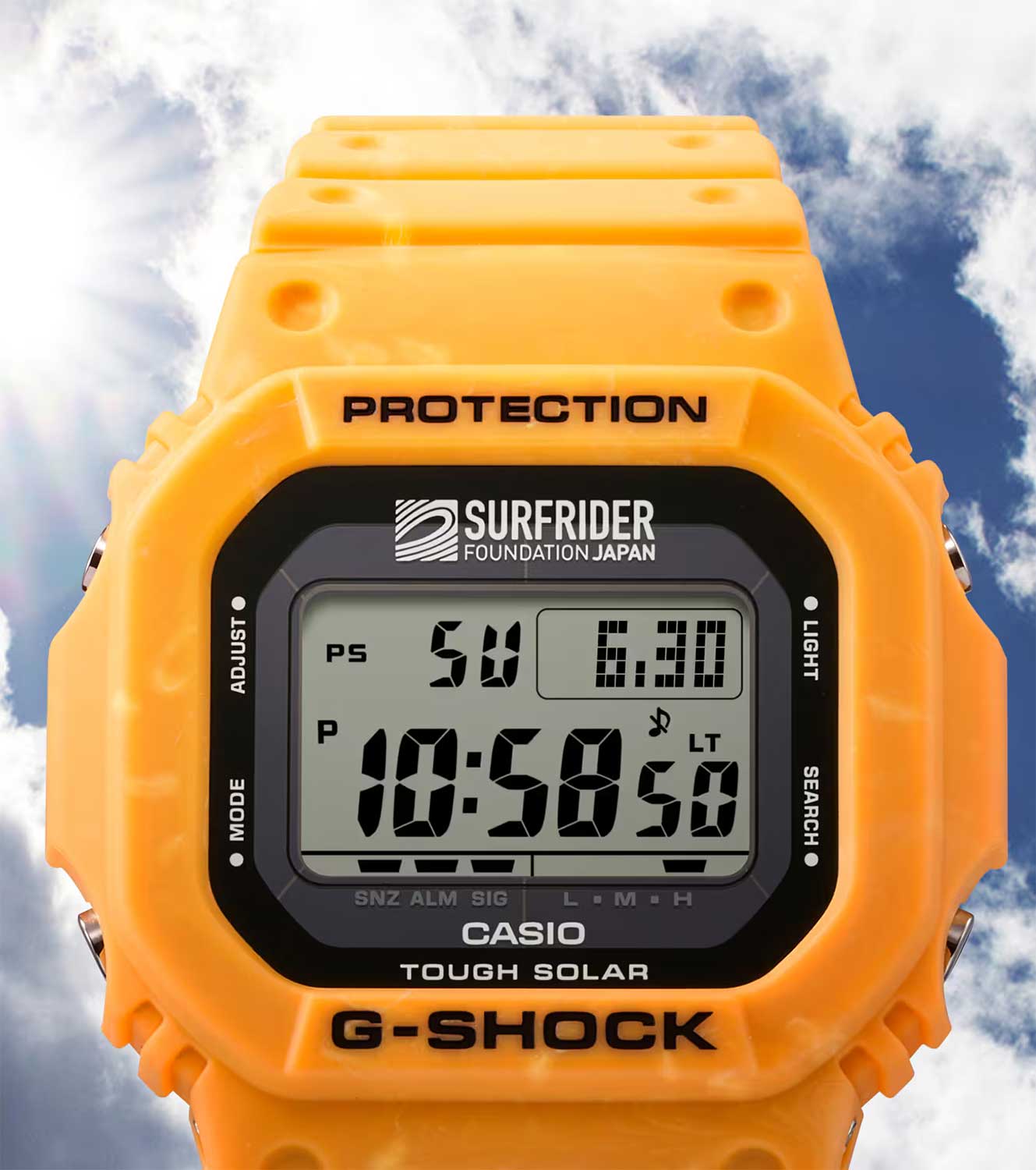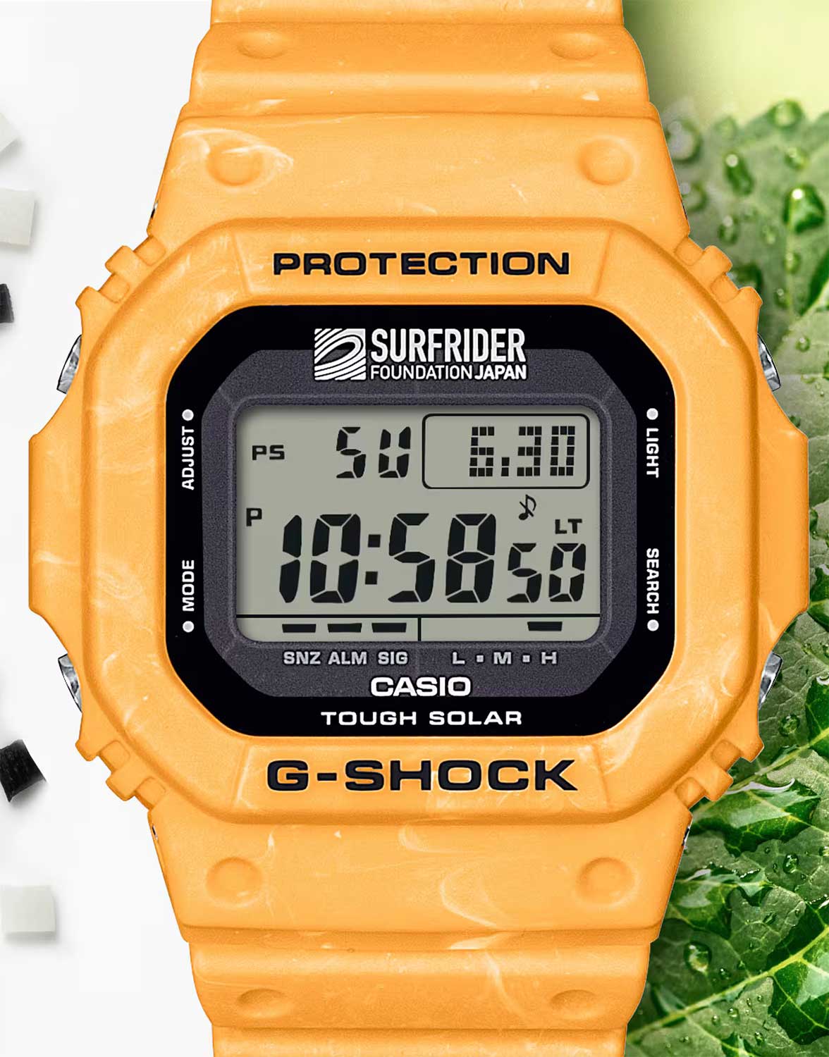 Surfrider Foundation Japan x G-Shock. Мужские часы. Модель создана в коллаборации с фондом Surfrider Foundation, который был основан в 1984 году и занимается защитой прибрежных экосистем. Корпус и ремешок выполнены из биопластика, который изготавливается из возобновляемых органических ресурсов.