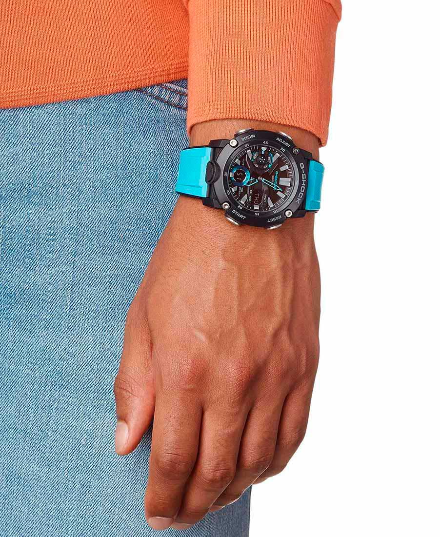 Яркие ударопрочные часы в черно-голубом исполнении для любителей активного образа жизни. G-Shock Carbon Core Guard. Новая серия часов со структурой Carbon Core Guard. Противоударный пластиковый корпус с карбоновыми волокнами более прочный и в то же время более легкий. Этот же материал защищает внутренний модуль от повреждений и деформаций при ударах. Улучшена ударопрочность конструкции кнопок, что устраняет необходимость во внешних защитных накладках. Многокомпонентный циферблат состоит из цифровых окошек указателей числа и дня недели, а также индикатора режима работы часов, который расположен в позиции 9 часов и выполнен в виде пропеллера. Светодиодная подсветка включается большой кнопкой расположенной в нижней части корпуса. Цвет подсветки: белый. Стрелки часов прозрачные и только края окрашены в яркий неоновый цвет, такой же, как и основной ремешок. Мировое время – 48 городов (31 часовой пояс). Функция включения/отключения летнего времени. 12-ти и 24-х часовой формат времени. Секундомер с точностью показаний 1/100с и временем измерения 24ч. Сплит-хронограф. Таймер обратного отсчета от 1/1мин до 24ч с автоповтором. Функция перемещения стрелок. Функция отключения/включения звука. Двойная задняя крышка: стальная закрывает механизм, а поверх неё закреплена пластина из пластика. Благодаря этой накладке у этой модели появилась функция быстрой смены ремешка.