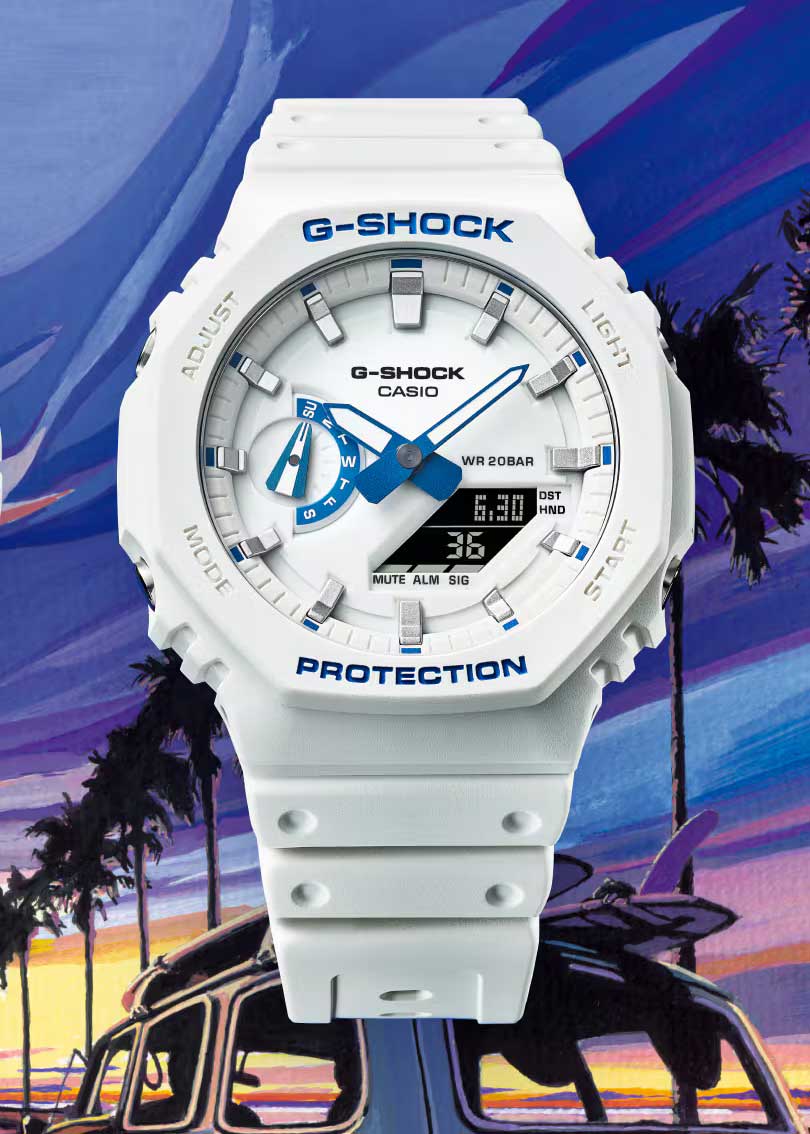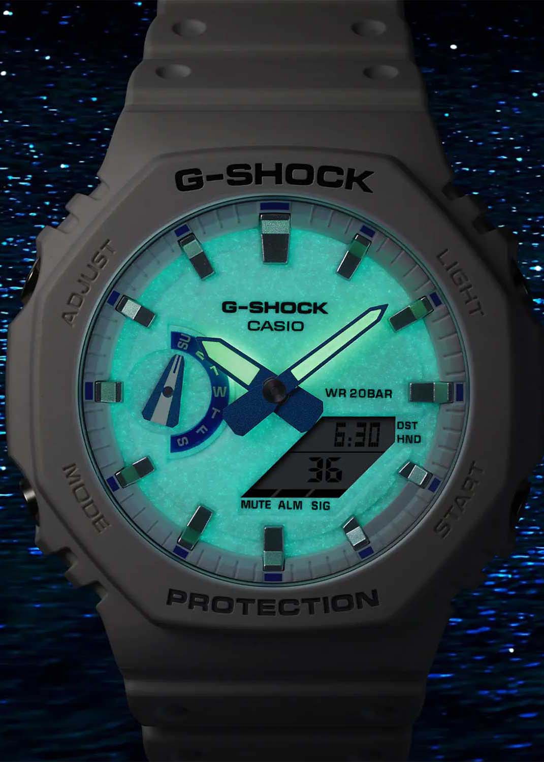 G-Shock. Мужские часы. Подсветка циферблата вдохновлена биолюминесцентным планктоном, плавающим в море. Корпус и ремешок выполнены из биопластика, который изготавливается из возобновляемых органических ресурсов.