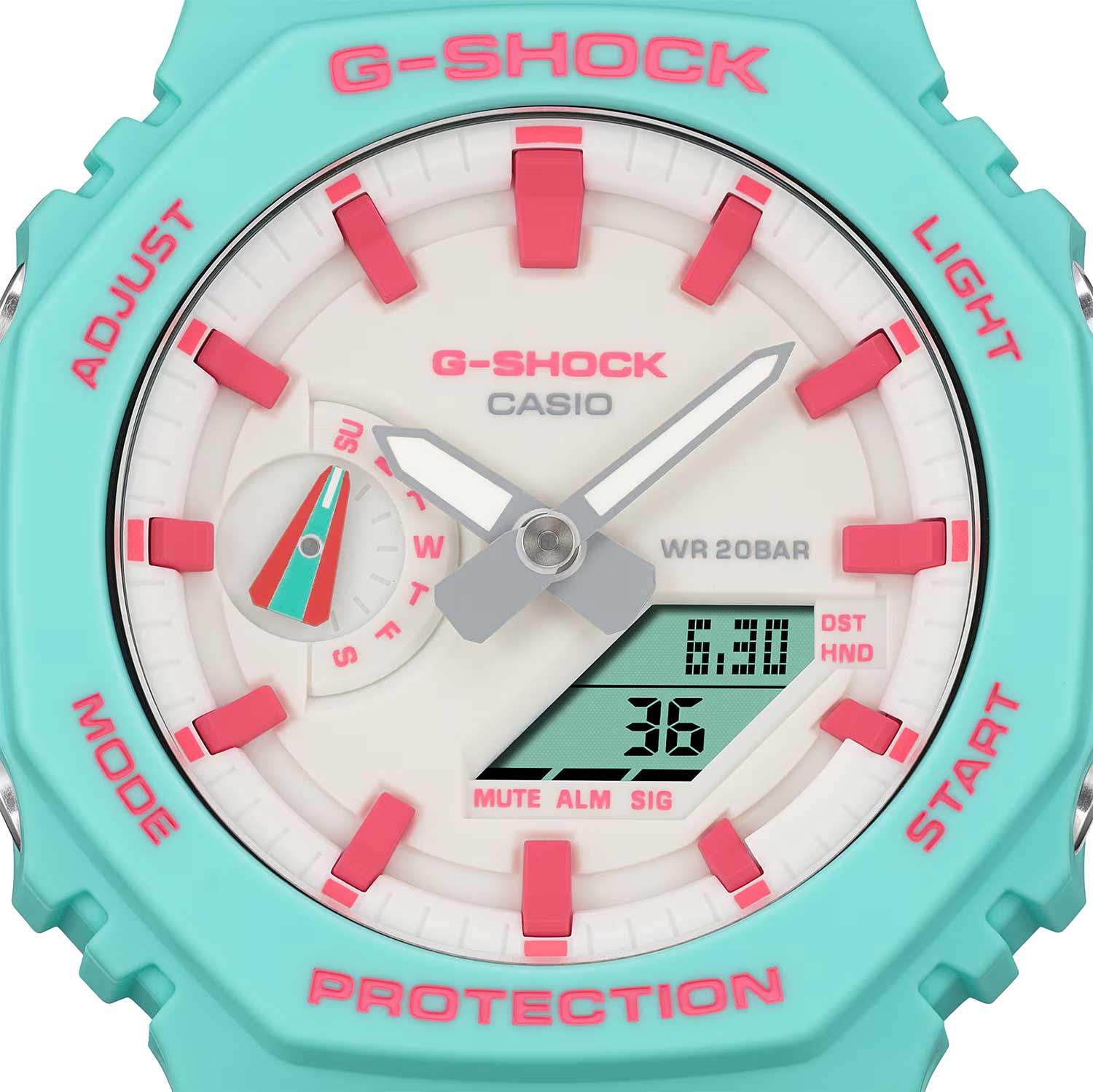Модель G-Shock x Rich Brian выпущена в коллаборации с индонезийским репером Ричем Брайаном. Структура Carbon Core Guard. Противоударный пластиковый корпус с карбоновыми волокнами более прочный и, в то же время, более легкий. Этот же материал защищает внутренний модуль от повреждений и деформаций при ударах.