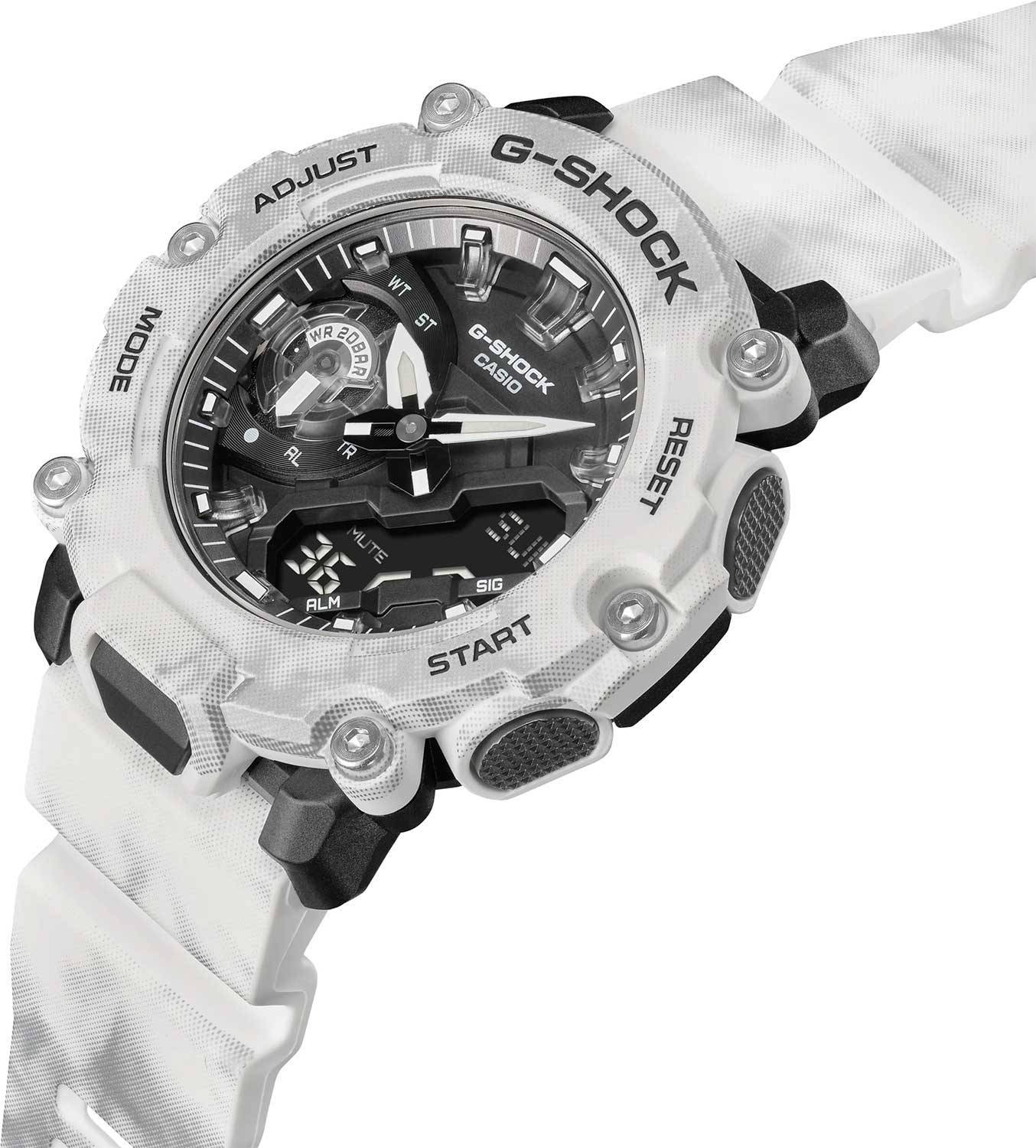 Надежные часы с глубоким и объемным циферблатом прекрасно подойдут для любителей активного образа жизни. G-Shock Frozen Forest. Новая серия часов со структурой Carbon Core Guard. Крупный противоударный пластиковый корпус с карбоновыми волокнами более прочный и, в то же время, более легкий. Этот же материал защищает внутренний модуль от повреждений и деформаций при ударах. Двойная светодиодная подсветка позволяет видеть в полной темноте не только аналоговый циферблат, но и цифровой дисплей. Послесвечение. Цвет подсветки: белый. Необритовое светонакопительное покрытие обеспечивает длительное послесвечение в темноте даже после кратковременного нахождения на свету. 12-ти и 24-х часовой формат времени. Секундомер с двумя точностями показаний: 1/100с (до 1ч) и 1с (после 1ч) и временем измерения 24ч. SPLIT-хронограф. Таймер обратного отсчета от 1с до 24ч. Мировое время – 48 городов (31 часовой пояс), всемирное координированное время (UTC). Функция включения/отключения летнего времени. Функции отключения/включения звука и перемещения стрелок для беспрепятственного просмотра информации на цифровых дисплеях. Стальная задняя крышка крепится на 4-х винтах. Батарейка рассчитана на 3 года. Водонепроницаемость в соответствии с ISO 22810. Удобный ремешок из полимерного материала с классической застежкой.