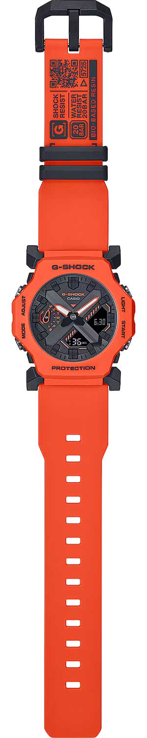 Мужские часы G-Shock. Корпус и ремешок выполнены из биопластика, который изготавливается из возобновляемых органических ресурсов. Противоударный корпус защищает механизм от ударов и вибрации.