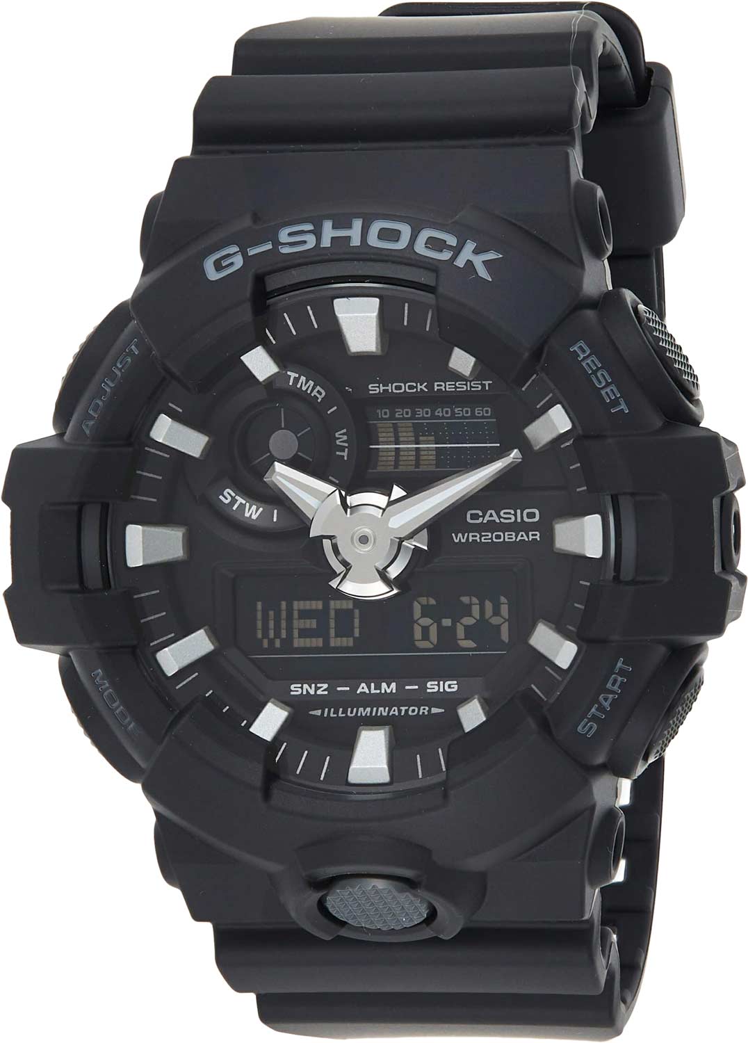 G-Shock представляет новые крупные многофункциональные спортивные часы для любителей экстремальных приключений.G-Shock. Мужские часы. Противоударный корпус защищает механизм от ударов и вибрации. Циферблат подсвечивается ярким светодиодом. В часах есть функция послесвечения - подсветка продолжает работать несколько секунд после того как кнопка подсветки была отпущена. Настраиваемое послесвечение 1,5 или 3сек. Цвет подсветки - белый. 12-ти и 24-х часовой формат времени. Секундомер с точностью показаний 1/100с и временем измерения 24ч. SPLIT-хронограф.Таймер обратного отсчета от 1мин до 1ч. Мировое время – 48 городов (31 часовой пояс), всемирное координированное время (UTC).