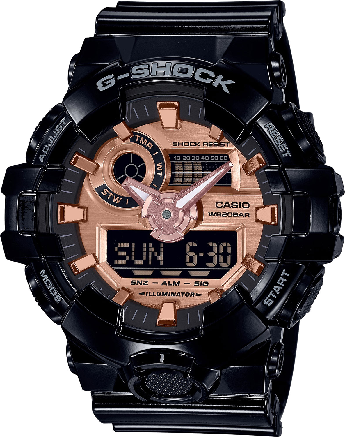 Благодаря новому переосмысленному дизайну и крупным стрелкам, часы имеют не только отличный внешний вид, но и обладают действительно удобной индикацией времени.G-Specials Color. Новый вариант модной расцветки модели GA-700, в ней циферблат цвета розового золота идеально дополняет черный ремешок и корпус. Противоударный корпус защищает механизм от ударов и вибрации. Светодиодная автоматическая супер-подсветка. При наклоне часов в сторону лица для считывания, функция автоподсветки обеспечивает автоматическое включение супер-яркой цветной подсветки. Цвет подсветки: белый. Мировое время – 48 городов (31 часовой пояс), всемирное координированное время (UTC). Функция включения/отключения летнего времени. 12-ти и 24-х часовой формат времени. Секундомер с точностью показаний 1/100с и временем измерения 24ч. Сплит-хронограф.Таймер