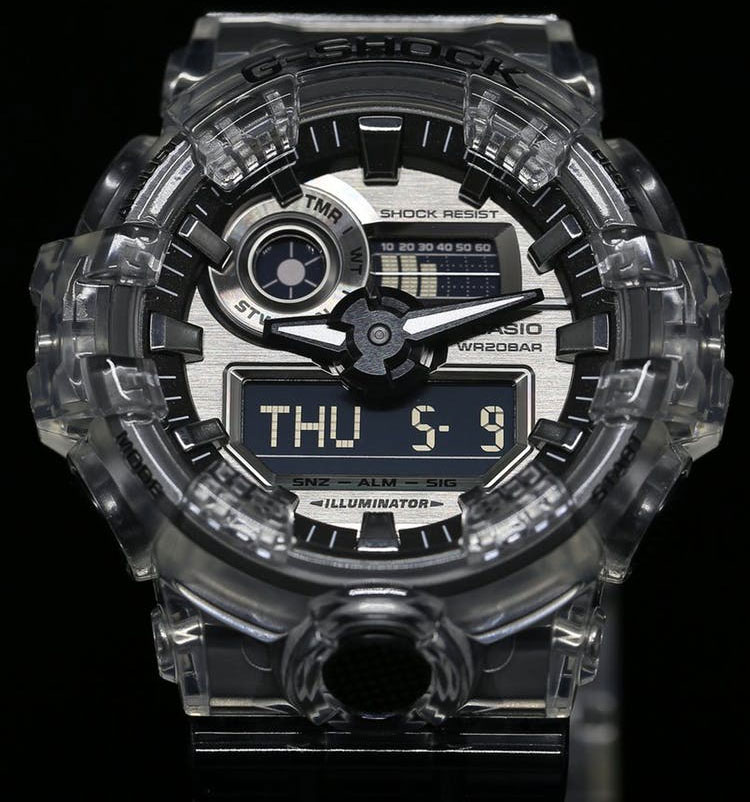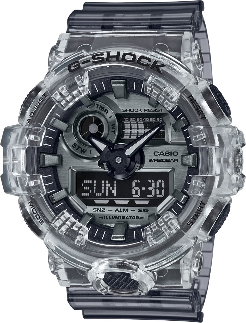 Благодаря новому переосмысленному дизайну и крупным стрелкам, часы имеют не только отличный внешний вид, но и обладают действительно удобной индикацией времени.G-Shock. Полупрозрачная модель часов создана на базе GA-700. Противоударный корпус защищает механизм от ударов и вибрации. Светодиодная автоматическая супер-подсветка. При наклоне часов в сторону лица для считывания, функция автоподсветки обеспечивает автоматическое включение супер-яркой цветной подсветки. Цвет подсветки: белый. Мировое время – 48 городов (31 часовой пояс), всемирное координированное время (UTC). Функция включения/отключения летнего времени. 12-ти и 24-х часовой формат времени. Секундомер с точностью показаний 1/100с и временем измерения 24ч. Сплит-хронограф.Таймер