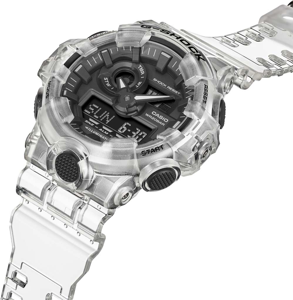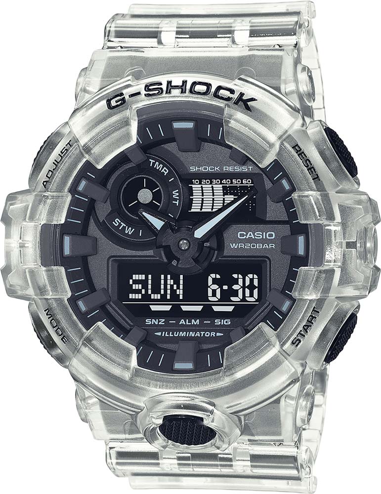 Благодаря стильному дизайну и крупным стрелкам, часы имеют не только отличный внешний вид, но и обладают действительно удобной индикацией времени.G-Shock. Новинка с прозрачным корпусом в серии часов GA-700. Противоударный корпус защищает механизм от ударов и вибрации. Циферблат подсвечивается ярким светодиодом. В часах есть функция послесвечения - подсветка продолжает работать несколько секунд после того как кнопка подсветки была отпущена. Цвет подсветки - белый. 12-ти и 24-х часовой формат времени. Секундомер с точностью показаний 1/100с и временем измерения 24ч. SPLIT-хронограф.Таймер обратного отсчета от 1мин до 1ч с автоповтором. Мировое время – 48 городов (31 часовой пояс), всемирное координированное время (UTC).