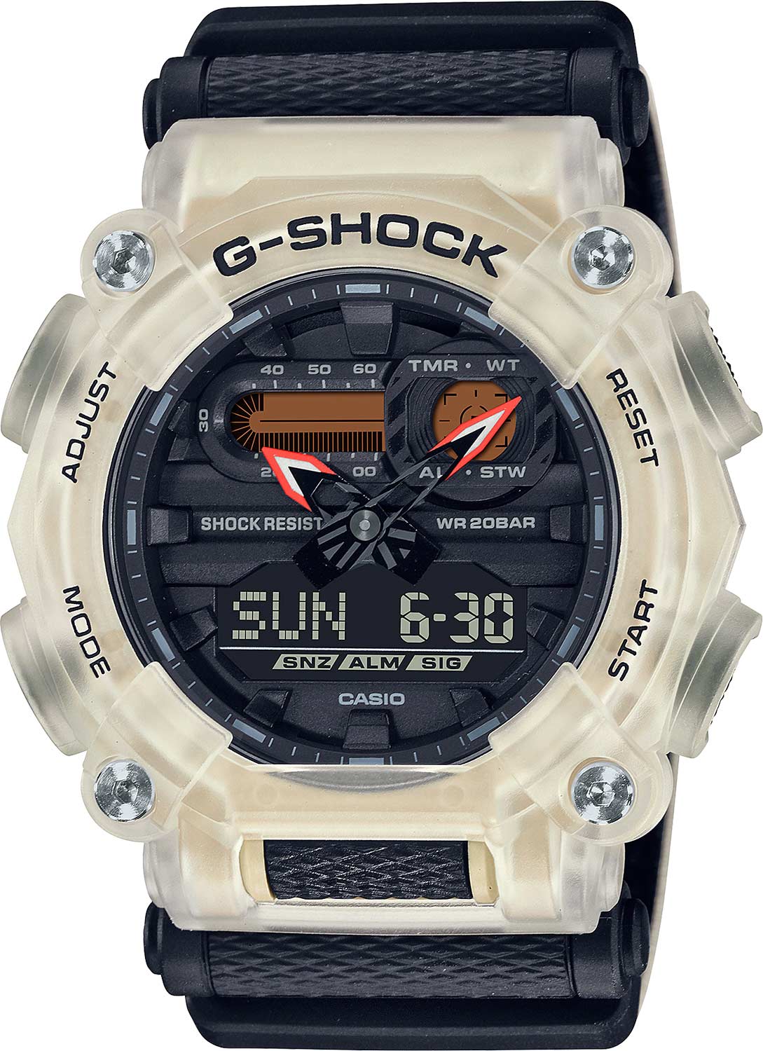 Каждый любитель экстремальных приключений достоин этих часов от Casio.G-Shock. Новый вариант модели GA-900 в полупрозрачном корпусе. Противоударный корпус защищает механизм от ударов и вибрации. Циферблат подсвечивается ярким светодиодом. В часах есть функция послесвечения - подсветка продолжает работать несколько секунд после того как кнопка подсветки была отпущена. Цвет подсветки: белый. 12-ти и 24-х часовой формат времени. Секундомер с точностью показаний 1/100с и временем измерения 24ч. SPLIT-хронограф.Таймер обратного отсчета от 1мин до 60мин. Мировое время – 48 городов (31 часовой пояс), всемирное координированное время (UTC).
