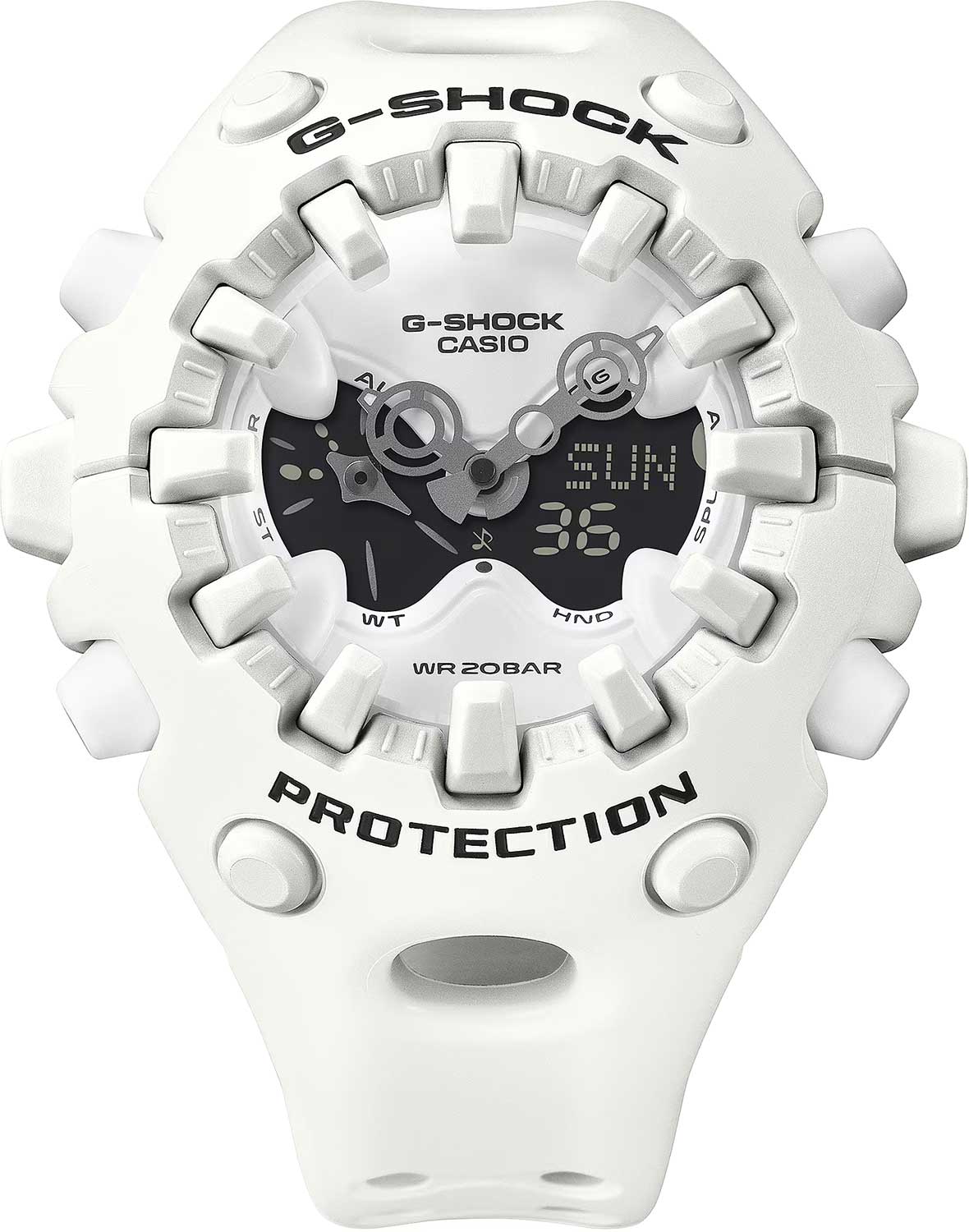 Новинка в серии G-Shock с ярким футуристичным дизайном. Система собственной разработки Casio Shock Release Hand, в которой стрелки не крепятся к валу напрямую, а крепятся с помощью магнитного поля, что позволяет эффективно поглощать и рассеивать удары. Противоударный корпус защищает механизм от ударов и вибрации.