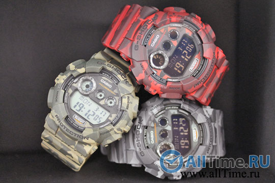 Первые, по настоящему, камуфляжные G-Shock подойдут как для профессиональных военных, так и для любителей экстремальных приключений. G-Classic. Циферблат подсвечивается ярким светодиодом, при недостаточном освещении во время поворота запястья в сторону лица подсветка включается автоматически. Противоударный корпус защищает механизм от ударов и вибрации. Секундомер с точностью показаний 1/100с и временем измерения 24ч. Сплит-хронограф. Таймер обратного отсчета от 1мин до 24ч. Мировое время. 12-ти и 24-х часовой формат времени. Функция включения/отключения звука.
