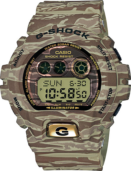 G-Shock представляет новые камуфляжные вариации для крупных и многофункциональных спортивных часов. G-Classic Camo. Светодиодная автоматическая супер-подсветка. При движении руки дисплей освещается ярким светом. Противоударный корпус защищает механизм от ударов и вибрации. Секундомер с точностью показаний 1/100с и временем измерения 24ч. Сплит-хронограф. Таймер обратного отсчета от 1мин до 24ч с автоповтором. Мировое время. 12-ти и 24-х часовой формат времени. Световая индикация сигнала. Функция включения/отключения звука.