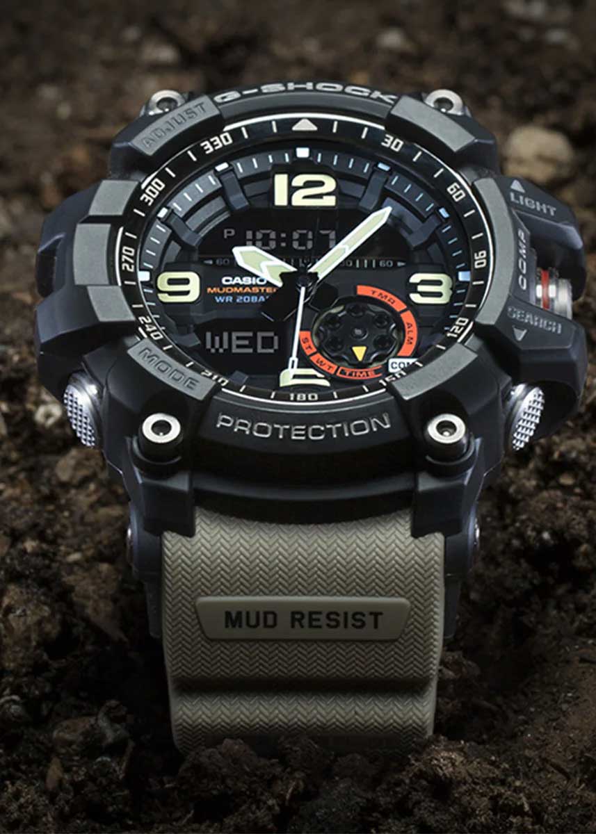 Mudmaster. Мужские часы. Противоударный корпус защищает механизм от ударов и вибрации. Защита от попадания внутрь пыли и грязи. Светодиодная автоматическая супер-подсветка. При движении руки дисплей освещается ярким светом. Настраиваемое послесвечение 1,5 или 3сек. Цвет подсветки: белый.