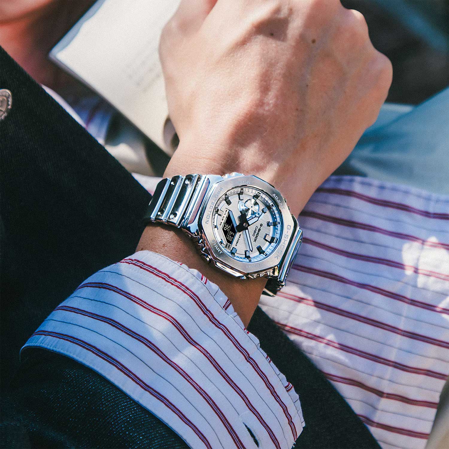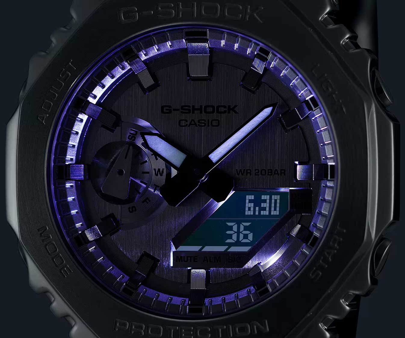 G-Shock. Мужские часы. Противоударный корпус защищает механизм от ударов и вибрации. Двойная подcветка: циферблат и ЖК-дисплеи подсвечиваются светодиодом, благодаря наличию функции задержки, после отпускания кнопки освещение горит еще несколько секунд. Настраиваемое послесвечение 1,5 или 3сек. Цвет подсветки: белый. Необритовое светонакопительное покрытие обеспечивает длительное послесвечение в темноте даже после кратковременного нахождения на свету.