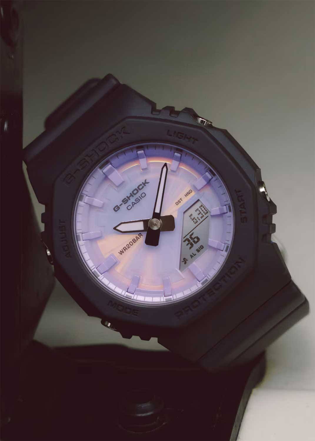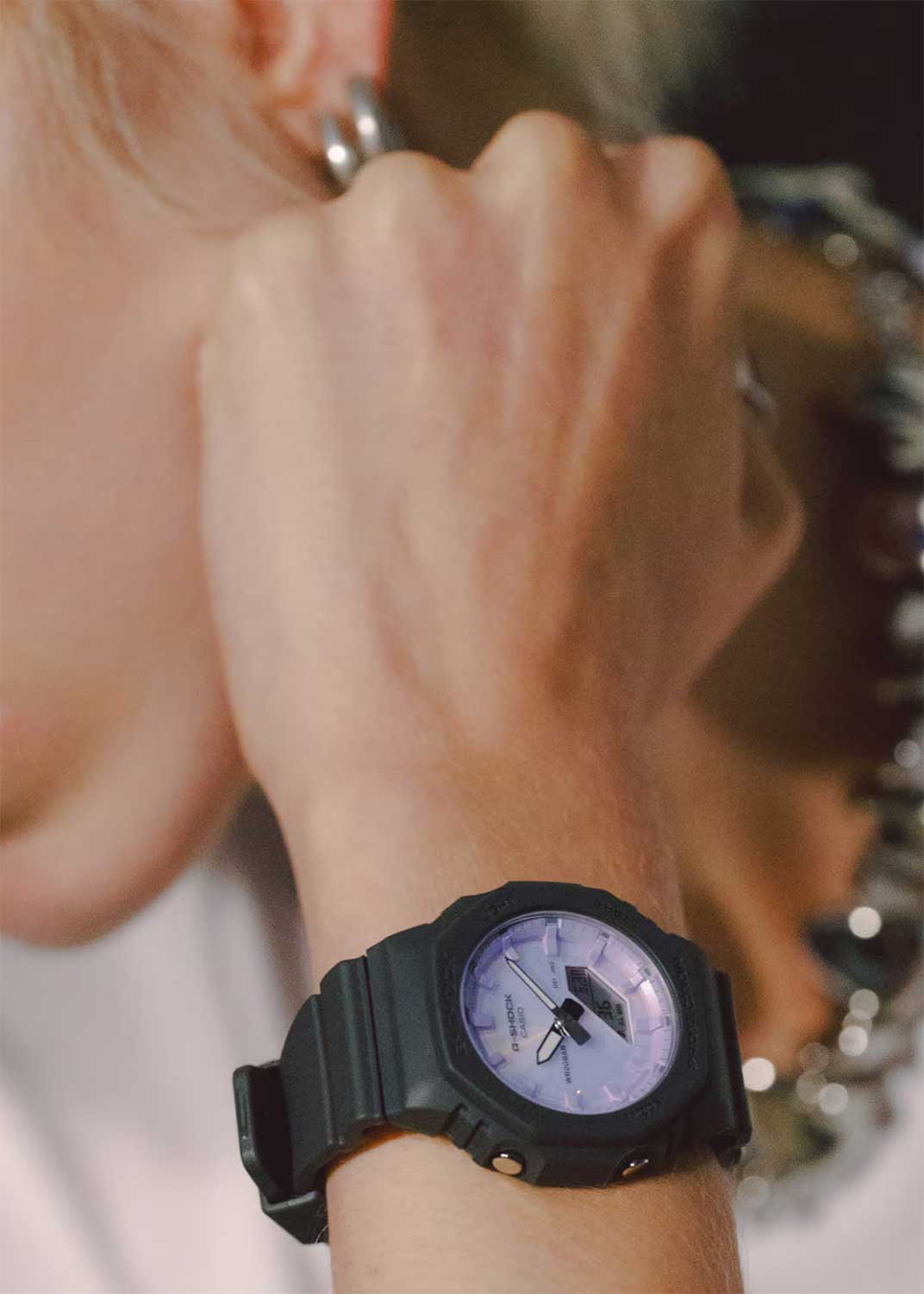 G-Shock. Женские часы. Циферблат украшен поляризованным цветным напылением, благодаря чему циферблат меняет тон и яркость при каждом повороте запястья. Корпус и ремешок выполнены из биопластика, который изготавливается из возобновляемых органических ресурсов. Противоударный корпус защищает механизм от ударов и вибрации.