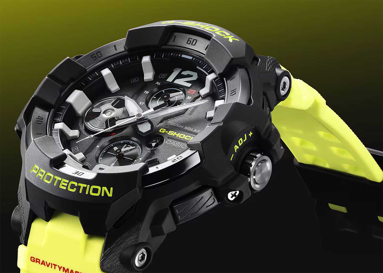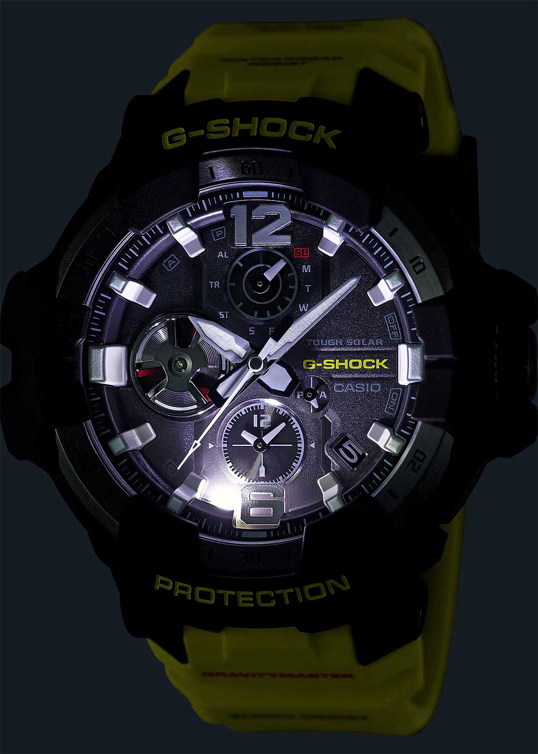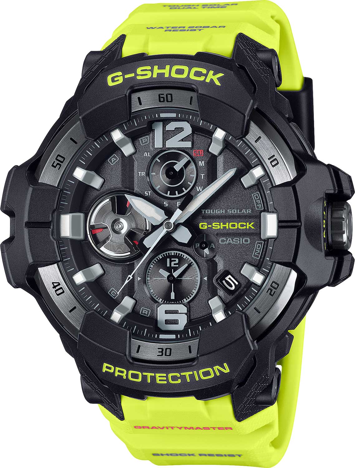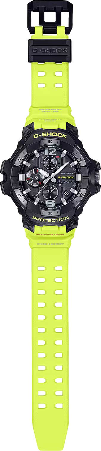 Новинка в серии часов Gravitymaster, дизайн которых вдохновлен приборной панелью самолета. Ярко-желтый ремешок вдохновлен аварийно-спасательными службами и знаками безопасности. Корпус и ремешок выполнены из биопластика, который изготавливается из возобновляемых органических ресурсов.