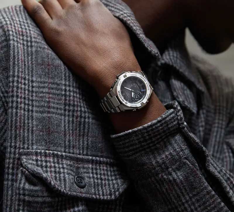 Линейка GST-B500 объединяет более компактные комплектующие и высокоплотное исполнение, по-прежнему обеспечивая связь Bluetooth и зарядку от солнечной энергии, но в еще более тонком корпусе. Карбоновый каркас поглощает внешние удары, обеспечивая истинную прочность G-STEEL, а удобная посадка на запястье добавляет комфорта. Уменьшенная защита кнопок позволила создать тонкие, но в то же время широкие кнопки, которые легко нажимать. Безель подвергался многократной обработке для создания исключительной металлической текстуры, видимой под любым углом, что позволяет добиться изысканного вида.G-Steel. Питание от солнечной энергии Tough Solar - солнечные батарейки большой мощности, индикатор заряда батареи. Функция автоматического сохранения энергии. Время работы аккумулятора без подзарядки приблизительно 7 месяцев, при включенной функции сохранения энергии приблизительно 18 месяцев. Противоударный корпус защищает механизм от ударов и вибрации. Ударопрочная конструкция Carbon Core Guard объединяет корпус и заднюю крышку в единый карбоновый моноблок. Двойная светодиодная подсветка Super Illuminator с функцией Afterglow (для подсветки не нужно удерживать кнопку, время послесвечения настраивается 1,5 или 3 сек): одновременно подсвечивается аналоговый циферблат и цифровой дисплей. Цвет подсветки: белый. Светонакопительное покрытие Neobrite обеспечивает длительное послесвечение в темноте даже после кратковременного нахождения на свету. 12-ти и 24-х часовой формат времени. Секундомер с точностью показаний 1/100 сек (до 1 ч) и 1 сек (после 1 ч) и временем измерения 24 ч. SPLIT-хронограф.