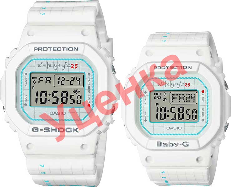 Набор G-Shock & Baby-G x G Presents Lover's Collection состоит из парных моделей часов DW-5600LJ-7 и BGD-560LJ-7W. Лимитированная серия посвящена 25-ти летию коллекции G Presents Lover's. Циферблат украшен уравнением x2-|x|y+y2=25, которое при построении создает график в виде сердца. Кнопка подсветки выделена ярким красным сердцем, при активации подсветки, на циферблате появляется яркое сердце. Задняя крышка крепится на 4-х винтах и украшена выгравированным изображением ангела и дьявола.