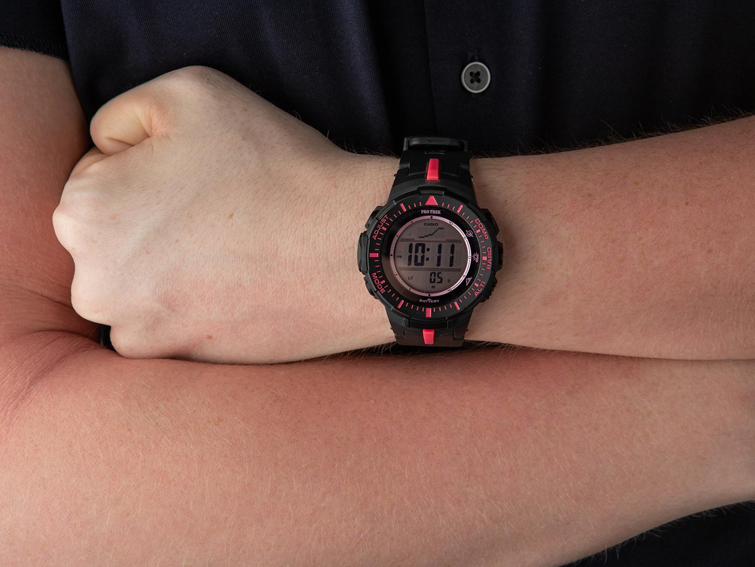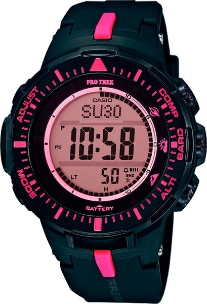 Часы Pro Trek создана для любителей активного отдыха и сочетают в себе самые продвинутые технические характеристики в привлекательном внешнем виде.Triple Sensor - General-Purpose Line. Питание от солнечной энергии Tough Solar - солнечные батарейки большой мощности, индикатор заряда батареи. Функция автоматического сохранения энергии. Время работы аккумулятора без подзарядки приблизительно 8 месяцев, при включенной функции сохранения энергии приблизительно 23 месяца. Модуль часов рассчитан на работу при низких температурах до -10°С/14°F. Циферблат подсвечивается ярким светодиодом, при недостаточном освещении во время поворота запястья в сторону лица подсветка включается автоматически. Мировое время – 48 городов (31 часовой пояс), всемирное координированное время (UTC). Функция включения/отключения летнего времени. 12-ти и 24-х часовой формат времени. Время восхода и захода Солнца. Технология Triple Sensor позволяет точно и легко определять сторону света, температуру и атмосферное давление. Термометр от -10° до +60°С с точностью 0,1°C. Барометр - измерение атмосферного давления от 260 до 1100 гПа (от 195 до 825 мм рт. ст.). Встроенный цифровой компас. Диапазон измерения от 0° до 359° с точностью 1°. Высотомер - встроенный датчик барометрического давления с возможностью вывода результатов в единицах высоты над уровнем моря (от -700 до 10000 метров). Секундомер с точностью показаний 1/10с и временем измерения 1000ч. Сплит-хронограф.Таймер