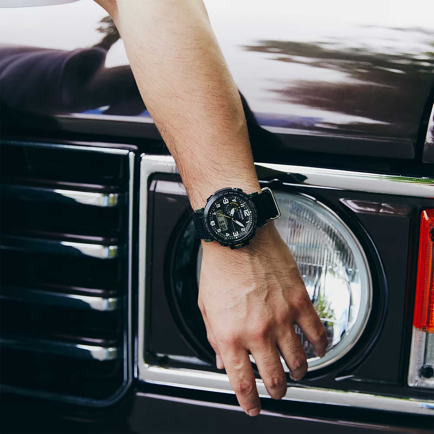 Любое ваше путешествие выйдет на новый уровень благодаря этим часам из коллекции Pro Trek.Pro Trek. Часы для активного отдыха. Корпус и ремешок изготовлены из возобновляемых ресурсов. Питание от солнечной энергии Tough Solar - солнечные батарейки большой мощности, индикатор заряда батареи. Функция автоматического сохранения энергии. Время работы аккумулятора без подзарядки приблизительно 7 месяцев, при включенной функции сохранения энергии приблизительно 25 месяцев. Модуль часов рассчитан на работу при низких температурах до -10°С/14°F. Двойная подcветка: циферблат и ЖК-дисплеи подсвечиваются светодиодом, благодаря наличию функции задержки, после отпускания кнопки освещение горит еще несколько секунд. Настраиваемое послесвечение 1,5 или 3сек. Цвет подсветки: белый. Необритовое светонакопительное покрытие обеспечивает длительное послесвечение в темноте даже после кратковременного нахождения на свету. 12-ти и 24-х часовой формат времени. Секундомер с точностью показаний 1/100с и временем измерения 24ч. SPLIT-хронограф.Таймер обратного отсчета от 1с до 1ч. Мировое время – 29 городов (29 часовых поясов), всемирное координированное время (UTC). Функция включения/отключения летнего времени. Переключение между домашним и мировым временем. Функция автоматической коррекции положения стрелок проверяет положение стрелок каждый час и корректирует его в случае необходимости. Технология Triple Sensor позволяет точно и легко определять сторону света, температуру и атмосферное давление. Термометр от -10° до +60°С с точностью 0,1°C. Барометр