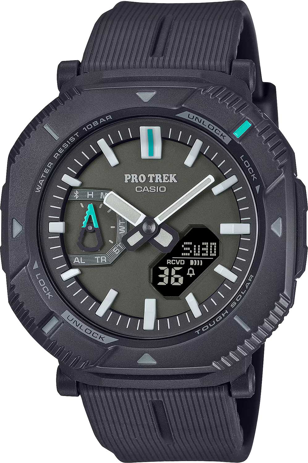 Этот аксессуар не только обладает базовыми функциями для приключений, но и имеет стильный и интересный дизайн. Pro Trek. Мужские часы. Уникальный поворотный безель позволит в одно движение сменить стиль часов, а также получить доступ к кнопкам, которые он защищает от случайного нажатия. Корпус и ремешок выполнены из биопластика, который изготавливается из возобновляемых органических ресурсов. Питание от солнечной энергии Tough Solar - солнечные батарейки большой мощности, индикатор заряда батареи. Функция автоматического сохранения энергии. Время работы аккумулятора без подзарядки приблизительно 7 месяцев, при включенной функции сохранения энергии приблизительно 18 месяцев. Модуль часов рассчитан на работу при низких температурах до -10°С. Двойная подcветка: циферблат и ЖК-дисплеи подсвечиваются светодиодом, благодаря наличию функции задержки, после отпускания кнопки освещение горит еще несколько секунд. Настраиваемое послесвечение 1,5 или 3сек. Цвет подсветки: белый. Необритовое светонакопительное покрытие обеспечивает длительное послесвечение в темноте даже после кратковременного нахождения на свету. 12-ти и 24-х часовой формат времени. Секундомер с двумя точностями показаний: 1/100с (до 1ч) и 1с (после 1ч) и временем измерения 24ч. SPLIT-хронограф. Таймер обратного отсчета от 1с до 24ч. Мировое время – 38 городов (38 часовых поясов), всемирное координированное время (UTC). Автоматический переход на зимнее и летнее время, возможность включения/отключения данной функции. Отображение кода и названия города. Переключение между домашним и мировым временем. Беспроводная технология Bluetooth® со сверхнизким потреблением энергии для синхронизации со смартфоном с помощью приложения Casio Watches. При подключении к смартфону часы корректируют текущее время, копируют настройки мирового времени (300 городов), а также позволяют получить данные о месте и времени (нажатие кнопки на часах записывает текущее время и положение на карте в приложении). Отображение дня недели на шести языках. Функции перемещения стрелок для беспрепятственного просмотра информации на цифровых дисплеях, поиска телефона и включения/отключения звука. Стрелка в положении «9 часов» вдохновлена карабином. Безель вращается на 45 градусов. Задняя крышка крепится на 4-х винтах. Ремешок с классической застежкой и системой быстрой замены.