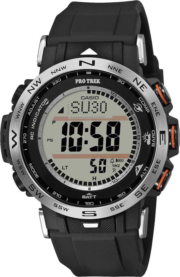 Очередная новинка от Casio. Часы для активных мужчин, которые не представляют свою жизнь без путешествий.Новинка в серии Pro Trek, которая выполнена в более компактном корпусе. Благодаря своим размерам и возможности быстро снять ремешок, они отлично подойдут для альпинистов. Питание от солнечной энергии Tough Solar - солнечные батарейки большой мощности, индикатор заряда батареи. Время работы аккумулятора без подзарядки приблизительно 6 месяцев, при включенной функции сохранения энергии приблизительно 22 месяцев. Модуль часов рассчитан на работу при низких температурах до -10°С/14°F. Циферблат подсвечивается ярким светодиодом, при недостаточном освещении во время поворота запястья в сторону лица подсветка включается автоматически. Послесвечение. Цвет подсветки: белый. 12-ти и 24-х часовой формат времени. Секундомер с точностью показаний 1/10с и временем измерения 1000ч. SPLIT-хронограф.Таймер обратного отсчета от 1с до 24ч. Мировое время – 48 городов (31 часовой пояс), всемирное координированное время (UTC). Функция включения/отключения летнего времени. Время восхода и захода Солнца. Технология Multi Band 6 позволяет принимать сигналы от шести радиовышек, расположенных в различных точках земного шара, которые передают временные сигналы от определенных атомных часов. Коррекция текущего времени радиосигналом на территории почти всей Европы, США, Японии и Китая. Термометр от -10° до +60°С с точностью 0,1°C. Барометр