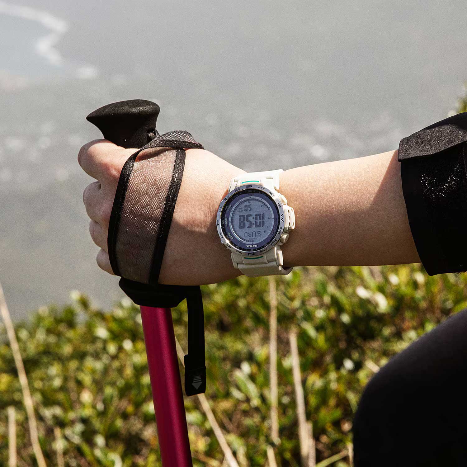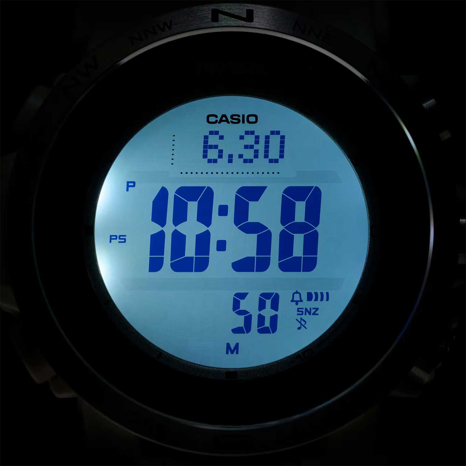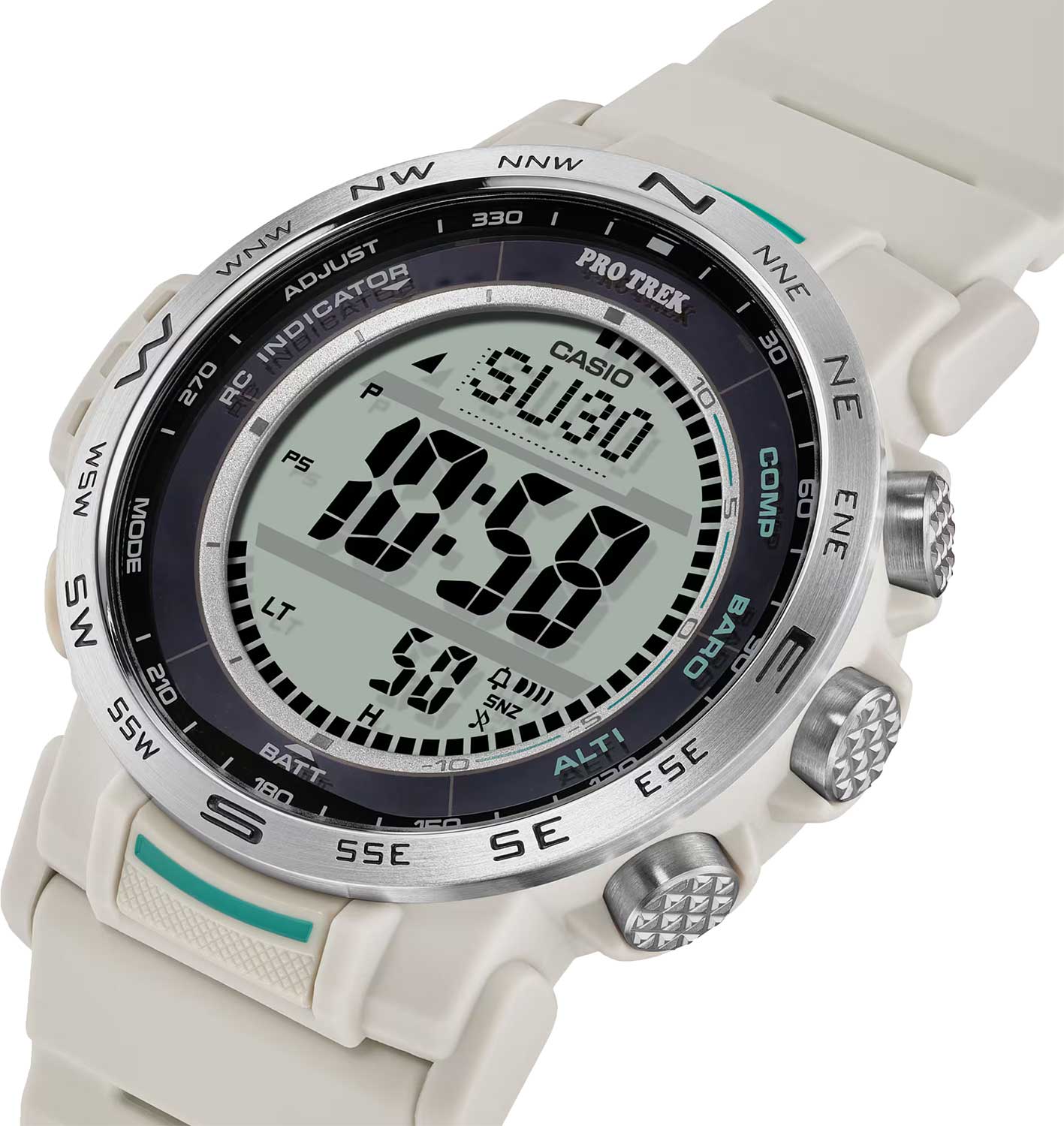 Функциональные часы Pro Trek - настоящая находка для тех, кто не представляет свою жизнь без приключений.Унисекс часы Pro Trek. Корпус и ремешок выполнены из биопластика, который изготавливается из возобновляемых органических ресурсов. Питание от солнечной энергии Tough Solar - солнечные батарейки большой мощности, индикатор заряда батареи. Функция автоматического сохранения энергии. Время работы аккумулятора без подзарядки - 6 месяцев, при включенной функции сохранения энергии - 22 месяца. Модуль часов рассчитан на работу при низких температурах до -10°С/14°F. Циферблат подсвечивается ярким светодиодом, при недостаточном освещении во время поворота запястья в сторону лица подсветка включается автоматически. Настраиваемое послесвечение 1,5 или 3сек. Цвет подсветки: белый. 12-ти и 24-х часовой формат времени. Секундомер с точностью показаний 1/10с и временем измерения 1000ч. SPLIT-хронограф.Таймер обратного отсчета от 1мин до 24ч. Мировое время – 48 городов. Переключение между домашним и мировым временем. Время восхода и захода Солнца на определенную дату. Технология Multi Band 6 позволяет принимать сигналы от шести радиовышек, расположенных в различных точках земного шара, которые передают временные сигналы от определенных атомных часов. Коррекция текущего времени радиосигналом на территории почти всей Европы, США, Японии и Китая. Термометр от -10° до +60°С с точностью 0,1°C. Барометр - измерение атмосферного давления от 260 до 1100 гПа (от 195 до 825 мм рт. ст.). Встроенный цифровой компас. Диапазон измерения от 0° до 359° с точностью 1°. Высотомер - встроенный датчик барометрического давления с возможностью вывода результатов в единицах высоты над уровнем моря от -700 до 10000 метров (от –2 300 до 32 800 футов). Единица измерения 1м (5 футов). График набора высоты. Хранение до 30 записей о высотных точках рельефа местности - измеренной абсолютной высоты, даты и времени. STN-LCD дисплей обеспечивает простоту считывания информации даже под углом. Функция отключения/включения звука. Стальной безель. Ремешок с классической застежкой и системой быстрой замены.