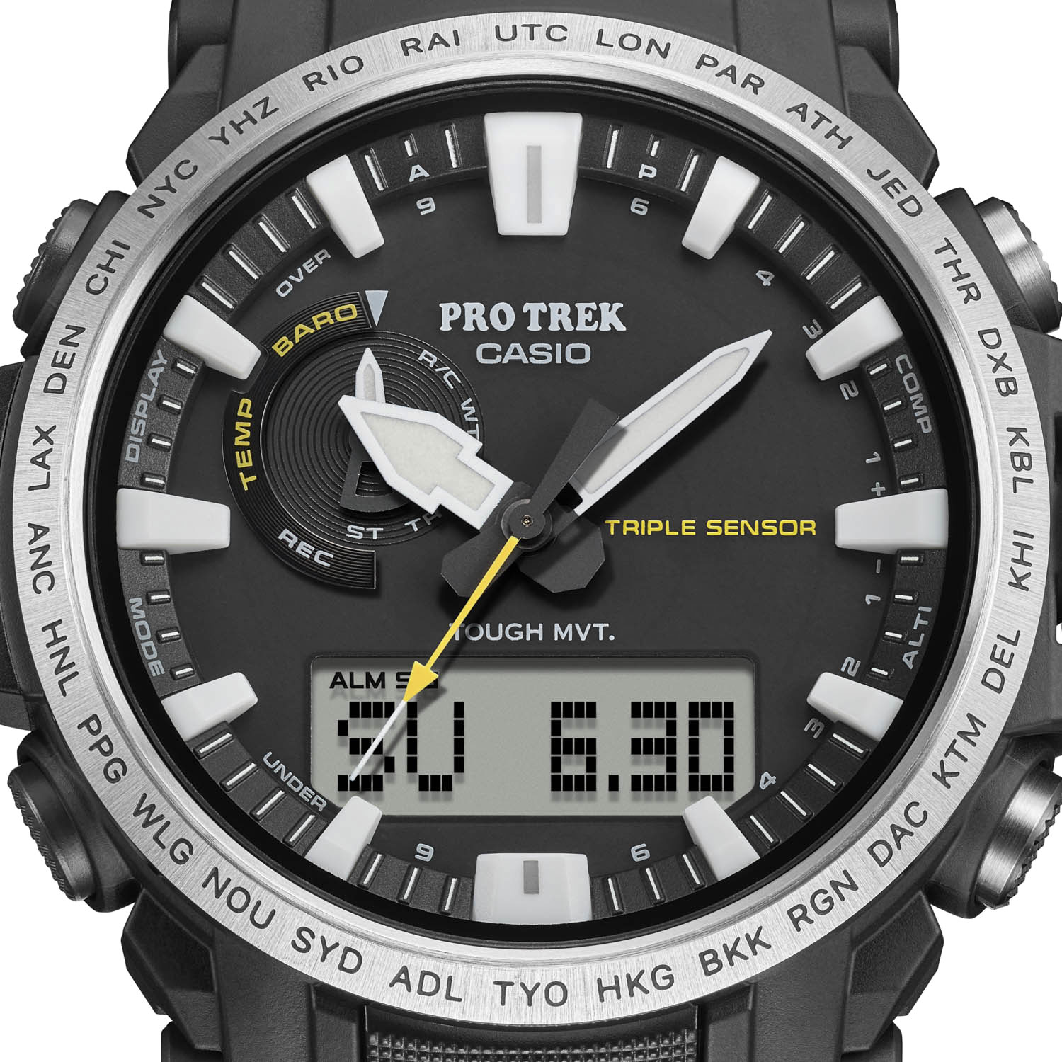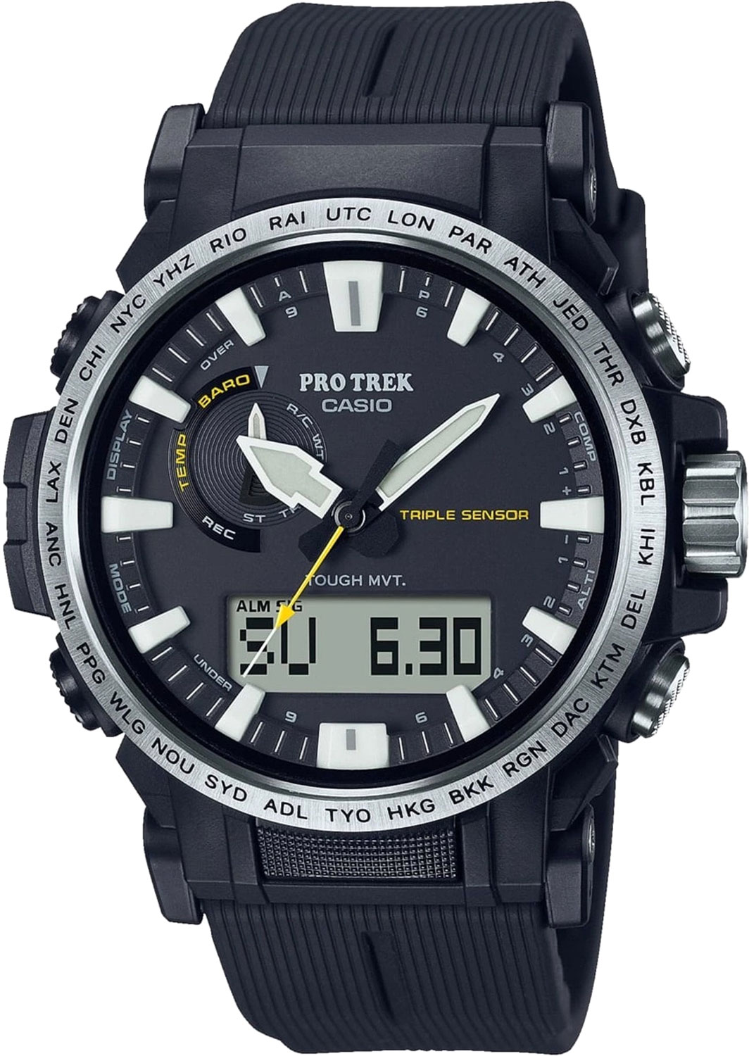 Коллекция Pro Trek символизирует переживание, наслаждение и сохранение чудес природы. В корпусе, ремешке и задней крышке часов PRW61 используется экологически чистый пластик из биоматериалов. Впервые в часах Pro Trek или любых других часах Casio корпус и ремешок изготовлены из экологически чистого биопластика вместо обычных полимеров. Использование биопластика также обеспечивает бескомпромиссную устойчивость к жестким условиям эксплуатации и комфорт на запястье. CASIO гордится применением этого нового материала для своей серии первоклассных инструментов для активного отдыха Pro Trek. Для обеспечения максимальной износостойкости и герметичности задняя крышка корпуса изготовлена из высокопрочного инженерного пластика, полученного из биоматериалов. Кроме того, задняя крышка имеет более широкую плоскую поверхность для повышения устойчивости к скручиванию. Контрастность циферблата повышена за счет использования яркого белого цвета больших штриховых индексов, часовой и минутной стрелок, что обеспечивает оптимальную видимость в полевых условиях. Для улучшения внешнего вида на безеле из нержавеющей стали выгравированы коды городов. В качестве оригинальной функции часы оснащены Multi Band 6 и Tough Solar. Многие фанаты горных восхождений и любители активного образа жизни знают, что Pro Trek — это именно те часы, на которые можно положиться.Корпус и ремешок выполнены из биопластика, который изготавливается из возобновляемых органических ресурсов. Питание от солнечной энергии Tough Solar - солнечные батарейки большой мощности, индикатор заряда батареи. Функция автоматического сохранения энергии. Время работы аккумулятора без подзарядки - 6 месяцев, при включенной функции сохранения энергии - 25 месяцев. Модуль часов рассчитан на работу при низких температурах до -10°С/14°F. Двойная подсветка: одно нажатие кнопки обеспечит подсветку не только цифрового дисплея, но и аналогового циферблата. Благодаря наличию функции задержки, после отпускания кнопки освещение горит еще несколько секунд. Настраиваемое послесвечение 1,5 или 3сек. Цвет подсветки: белый. Необритовое светонакопительное покрытие обеспечивает длительное послесвечение в темноте даже после кратковременного нахождения на свету. 12-ти и 24-х часовой формат времени. Секундомер с точностью показаний 1/100с и временем измерения 24ч. SPLIT-хронограф.Таймер обратного отсчета от 1мин до 1ч. Мировое время – 29 городов (29 часовых поясов), всемирное координированное время (UTC). Функция включения/отключения летнего времени. Переключение между домашним и мировым временем. Функция автоматической коррекции положения стрелок проверяет положение стрелок каждый час и корректирует его в случае необходимости. Технология Multi Band 6 позволяет принимать сигналы от шести радиовышек, расположенных в различных точках земного шара, которые передают временные сигналы от определенных атомных часов. Коррекция текущего времени радиосигналом на территории почти всей Европы, США, Японии и Китая. Термометр от -10° до +60°С с точностью 0,1°C. Барометр