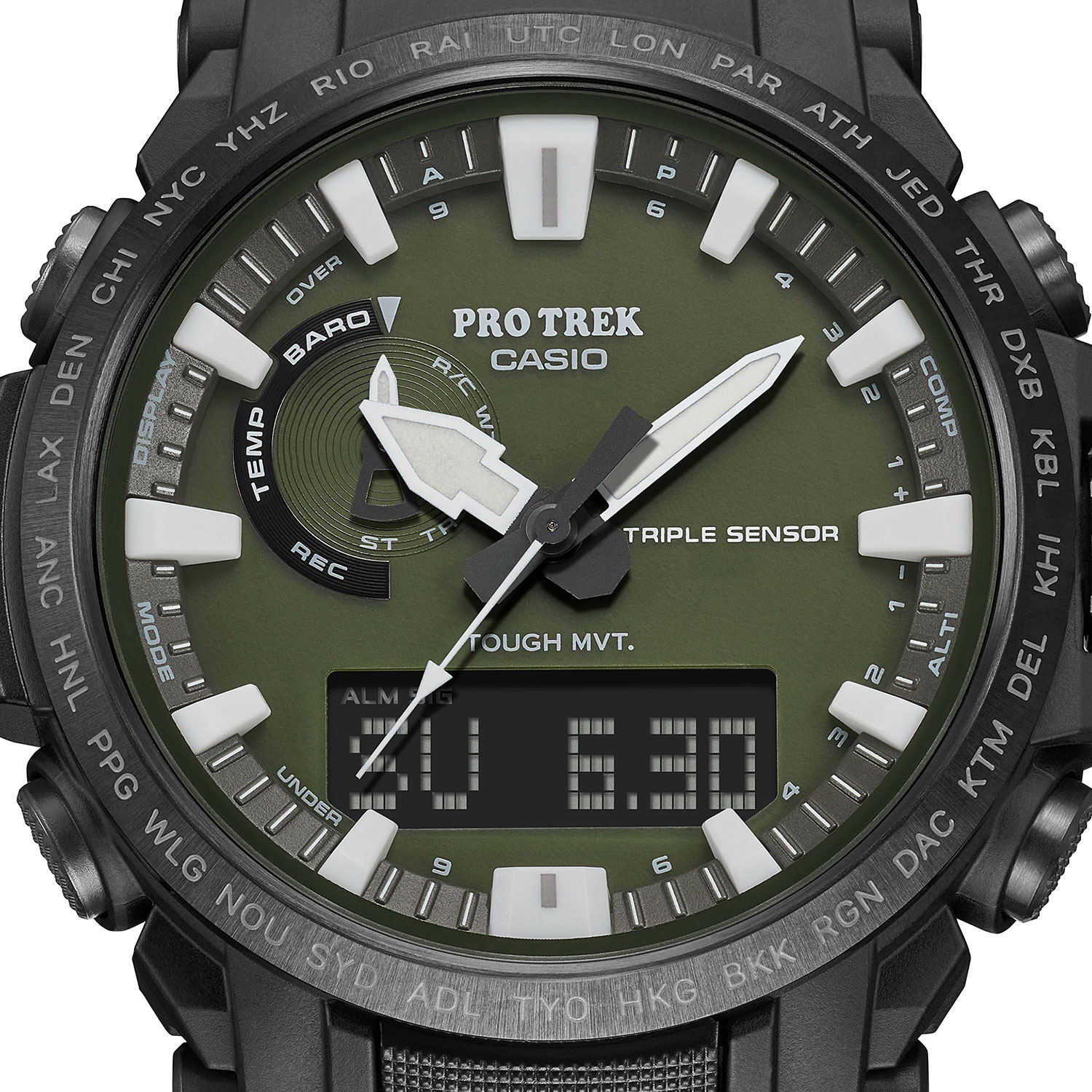 Коллекция Pro Trek символизирует переживание, наслаждение и сохранение чудес природы. В корпусе, ремешке и задней крышке часов PRW61 используется экологически чистый пластик из биоматериалов. Впервые в часах Pro Trek или любых других часах Casio корпус и ремешок изготовлены из экологически чистого биопластика вместо обычных полимеров. Использование биопластика также обеспечивает бескомпромиссную устойчивость к жестким условиям эксплуатации и комфорт на запястье. CASIO гордится применением этого нового материала для своей серии первоклассных инструментов для активного отдыха Pro Trek. Для обеспечения максимальной износостойкости и герметичности задняя крышка корпуса изготовлена из высокопрочного инженерного пластика, полученного из биоматериалов. Кроме того, задняя крышка имеет более широкую плоскую поверхность для повышения устойчивости к скручиванию. Контрастность циферблата повышена за счет использования яркого белого цвета больших штриховых индексов, часовой и минутной стрелок, что обеспечивает оптимальную видимость в полевых условиях. Для улучшения внешнего вида на безеле из нержавеющей стали выгравированы коды городов. В качестве оригинальной функции часы оснащены Multi Band 6 и Tough Solar. Многие фанаты горных восхождений и любители активного образа жизни знают, что Pro Trek — это именно те часы, на которые можно положиться.Корпус и ремешок выполнены из биопластика, который изготавливается из возобновляемых органических ресурсов. Питание от солнечной энергии Tough Solar - солнечные батарейки большой мощности, индикатор заряда батареи. Функция автоматического сохранения энергии. Время работы аккумулятора без подзарядки - 6 месяцев, при включенной функции сохранения энергии - 25 месяцев. Модуль часов рассчитан на работу при низких температурах до -10°С/14°F. Двойная подсветка: одно нажатие кнопки обеспечит подсветку не только цифрового дисплея, но и аналогового циферблата. Благодаря наличию функции задержки, после отпускания кнопки освещение горит еще несколько секунд. Настраиваемое послесвечение 1,5 или 3сек. Цвет подсветки: белый. Необритовое светонакопительное покрытие обеспечивает длительное послесвечение в темноте даже после кратковременного нахождения на свету. 12-ти и 24-х часовой формат времени. Секундомер с точностью показаний 1/100с и временем измерения 24ч. SPLIT-хронограф.Таймер обратного отсчета от 1мин до 1ч. Мировое время – 29 городов (29 часовых поясов), всемирное координированное время (UTC). Функция включения/отключения летнего времени. Переключение между домашним и мировым временем. Функция автоматической коррекции положения стрелок проверяет положение стрелок каждый час и корректирует его в случае необходимости. Технология Multi Band 6 позволяет принимать сигналы от шести радиовышек, расположенных в различных точках земного шара, которые передают временные сигналы от определенных атомных часов. Коррекция текущего времени радиосигналом на территории почти всей Европы, США, Японии и Китая. Термометр от -10° до +60°С с точностью 0,1°C. Барометр