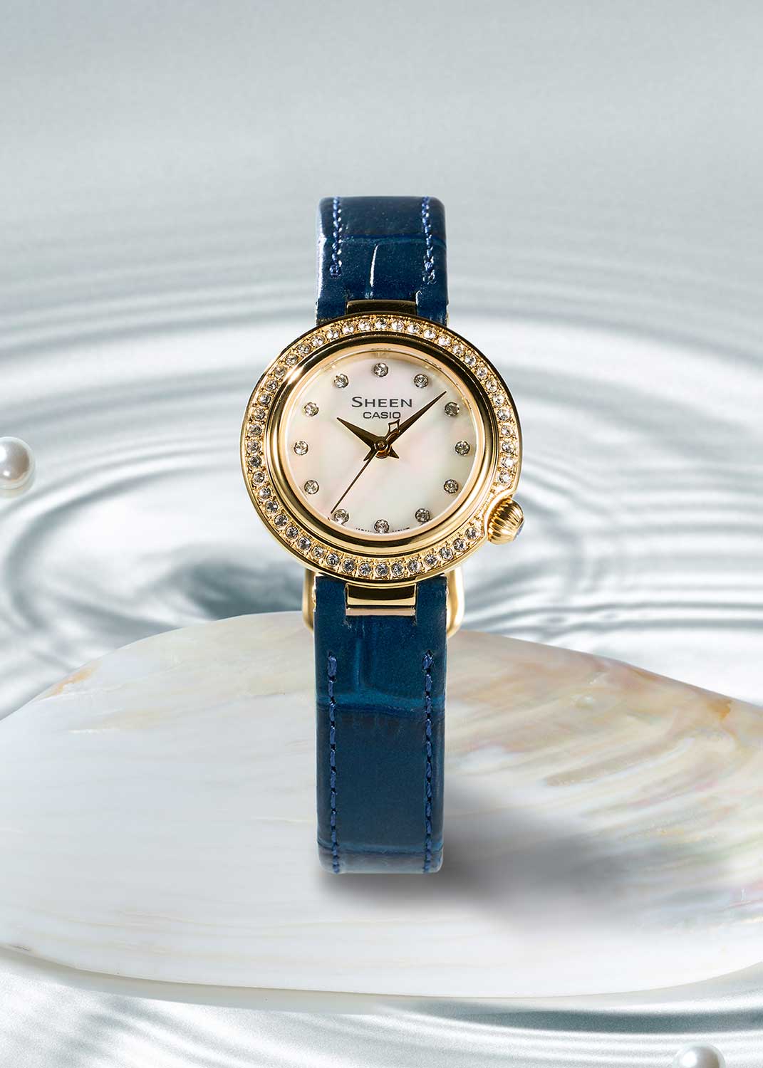 Sheen. Женские часы со стальным корпусом. Перламутровый циферблат защищен прочным сапфировым стеклом. Метки в виде точек, инкрустированных кристаллами. Рифленая заводная головка с защитой находится в положении 4 часа. Безель украшен паве из кристаллов. Батарейка рассчитана на 3 года. Ремешок с классической застежкой.