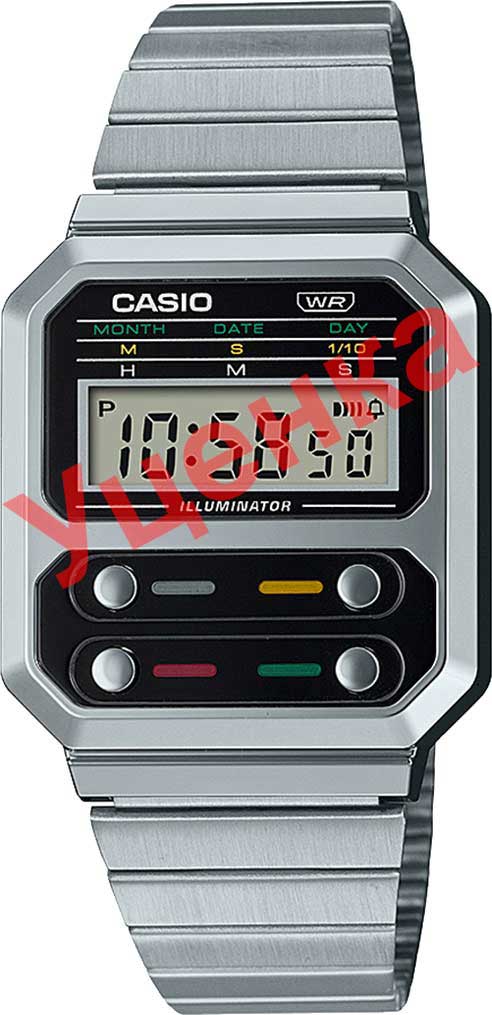 Vintage. Унисекс. Часы являются копией модели F-100, которая была первой моделью Casio в пластиковом корпусе. Отличительной чертой часов являются 4 кнопки на лицевой панели. Циферблат подсвечивается светодиодом. Цвет подсветки: красный. Секундомер с точностью показаний 1/10с и временем измерения 1ч. Батарея рассчитана на 3 года. Водонепроницаемость в соответствии с DIN 8310/ISO 2281. Батарея рассчитана на 3 года. Браслет с регулируемой застежкой.