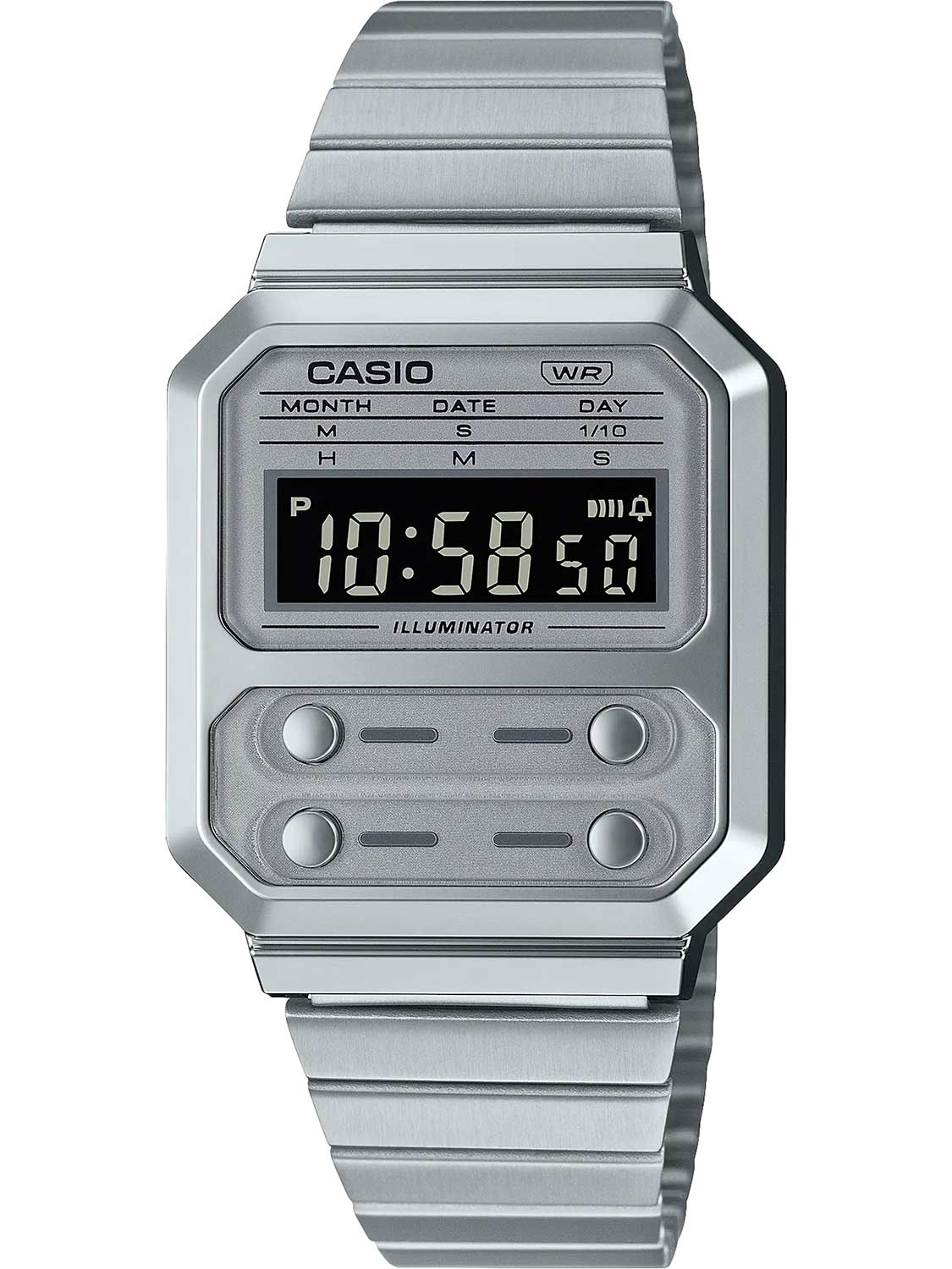 Модный ретро-аксессуар станет одним из главных экспонатов в вашей коллекции часов. Vintage. Унисекс. Часы являются копией модели F-100, которая была первой моделью Casio в пластиковом корпусе. Отличительной чертой часов являются 4 кнопки на лицевой панели. Циферблат подсвечивается светодиодом. Цвет подсветки: оранжевый. Секундомер с точностью показаний 1/10с и временем измерения 1ч. Водонепроницаемость в соответствии с DIN 8310/ISO 2281. Батарея рассчитана на 3 года. Браслет с регулируемой застежкой.