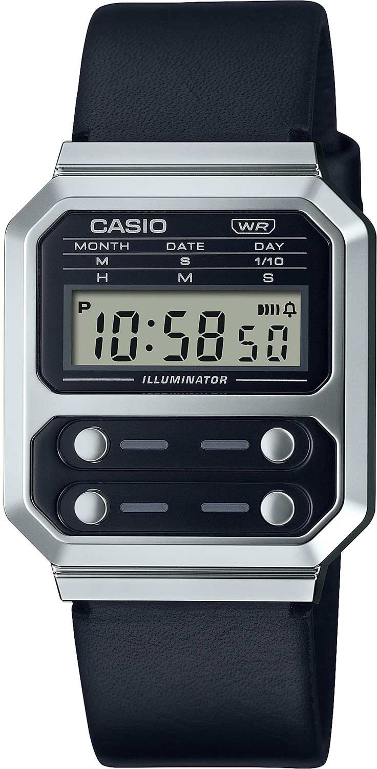 Vintage. Унисекс. Часы являются копией модели F-100, которая была первой моделью Casio в пластиковом корпусе. Отличительной чертой часов являются 4 кнопки на лицевой панели. Циферблат подсвечивается светодиодом. Цвет подсветки: оранжевый. Секундомер с точностью показаний 1/10с и временем измерения 1ч. Водонепроницаемость в соответствии с DIN 8310/ISO 2281. Батарея рассчитана на 3 года. Ремешок с классической застежкой.