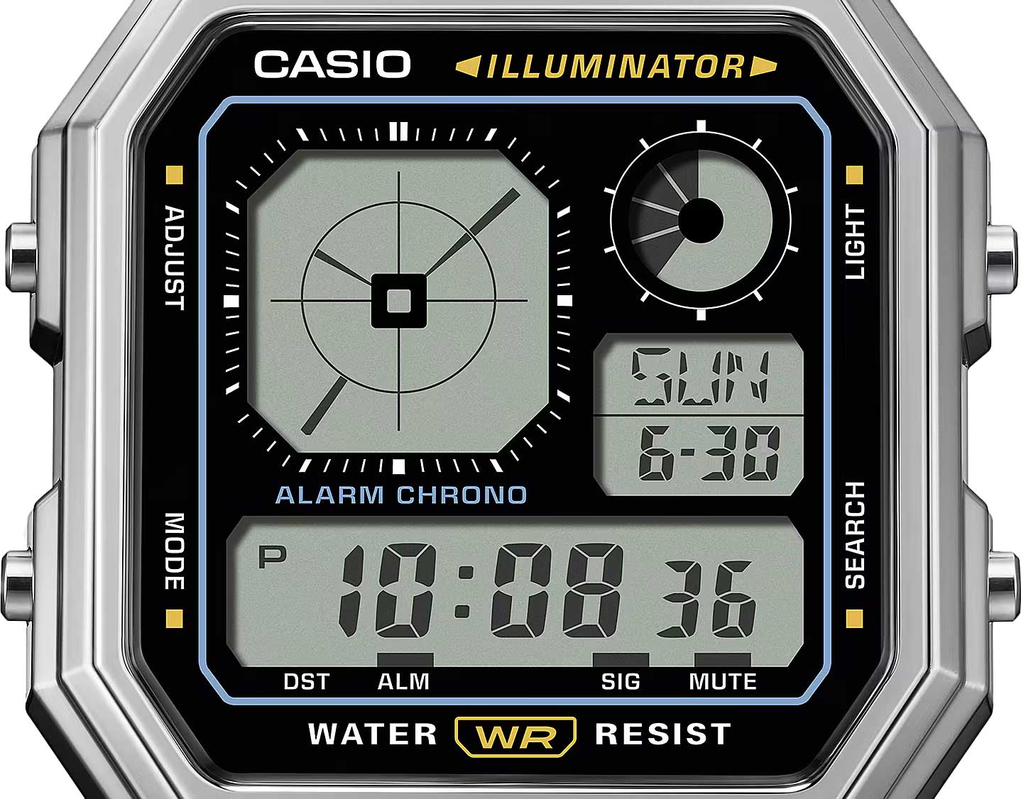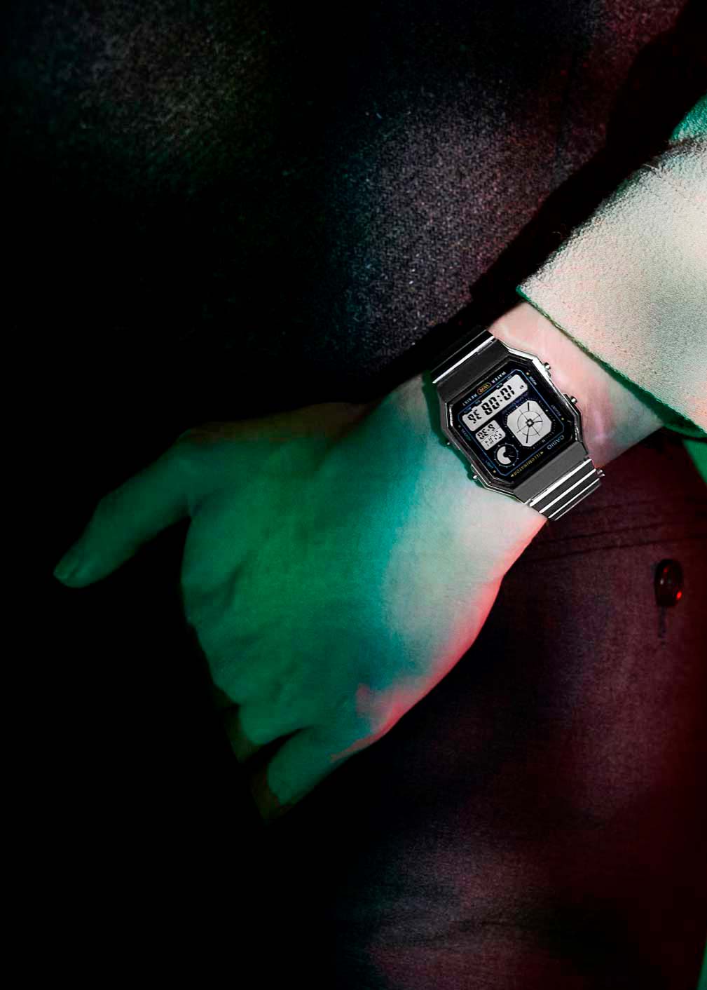 Vintage. Унисекс часы. Циферблат подсвечивается светодиодом. Настраиваемое послесвечение 1,5 или 3сек. Цвет подсветки: оранжевый. 12-ти и 24-х часовой формат времени. Секундомер с точностью показаний 1/100с и временем измерения 24ч. SPLIT-хронограф. Таймер обратного отсчета от 1с до 24ч. Мировое время – 48 городов (31 часовой пояс), всемирное координированное время (UTC). Переход на зимнее и летнее время, возможность включения/отключения данной функции. Переключение между домашним и мировым временем. Режим «Мульти Тайм» - показания текущего времени в 4-х зафиксированных городах. Функция включения/отключения звука. Батарея рассчитана на 3 года. Стальная задняя крышка. Браслет с регулируемой застежкой.