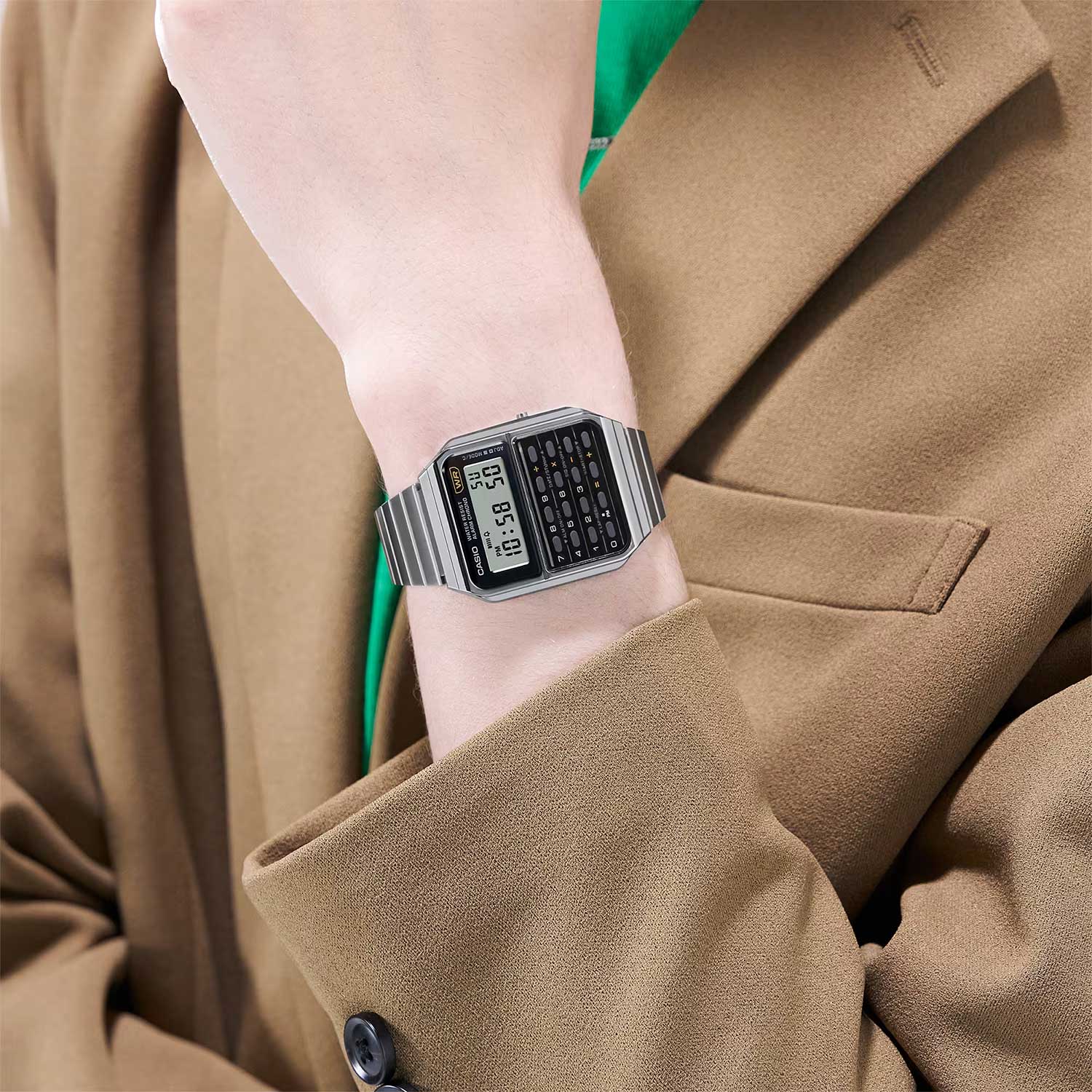 Часы в популярном ретро-стиле никогда не выйдут из моды и будут актуальны во все времена. Vintage. Унисекс. Калькулятор позволяет производить различные математические вычисления, используя числа, содержащие до 8 знаков. Второй часовой пояс. 12-ти и 24-х часовой формат времени. Секундомер с точностью показаний 1/100с и временем измерения 24ч. SPLIT-хронограф. Возможность включения или выключения звука кнопок. Стальная задняя крышка крепится на 4-х винтах. Батарея рассчитана на 5 лет. Браслет с регулируемой застежкой.