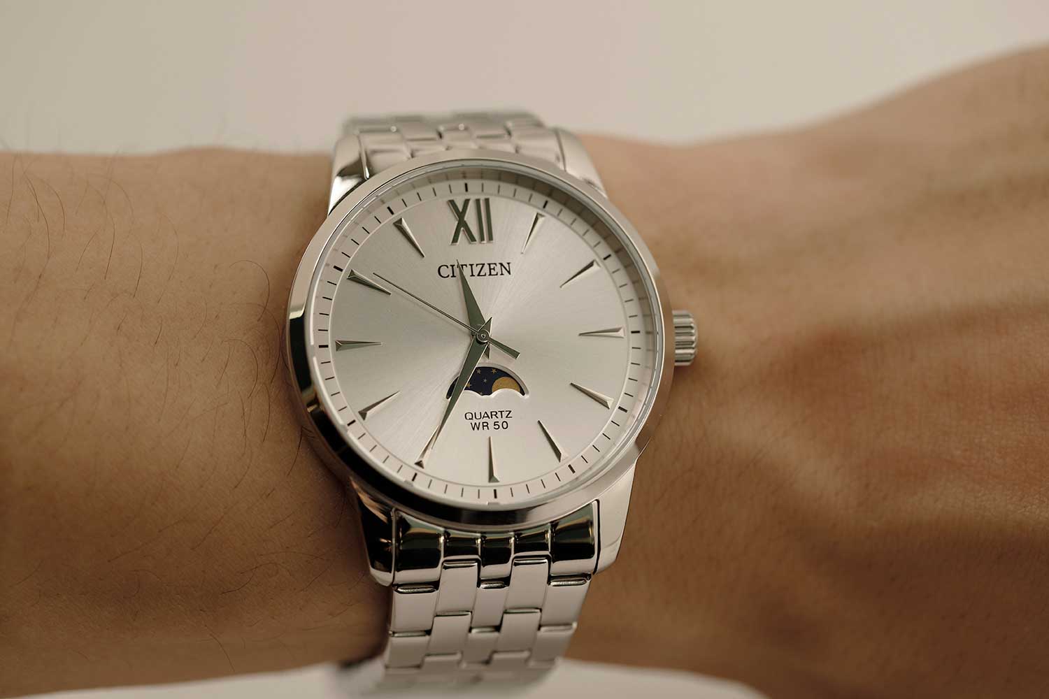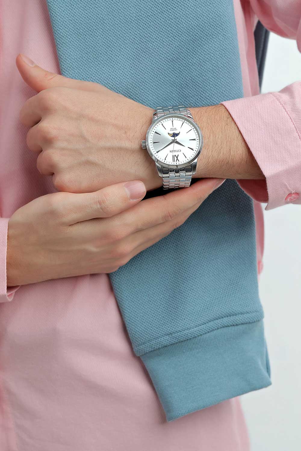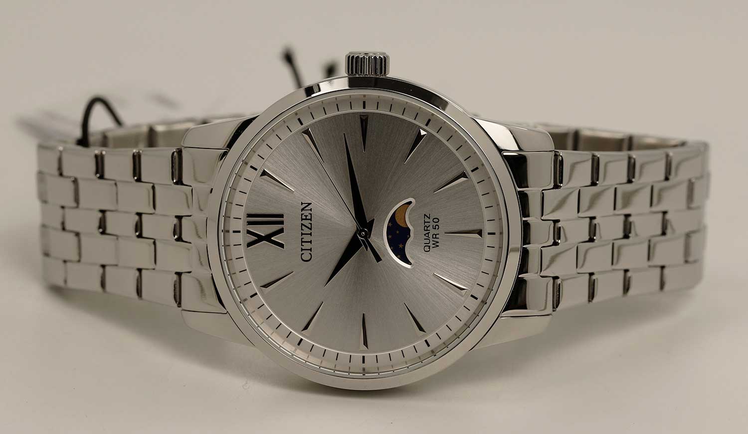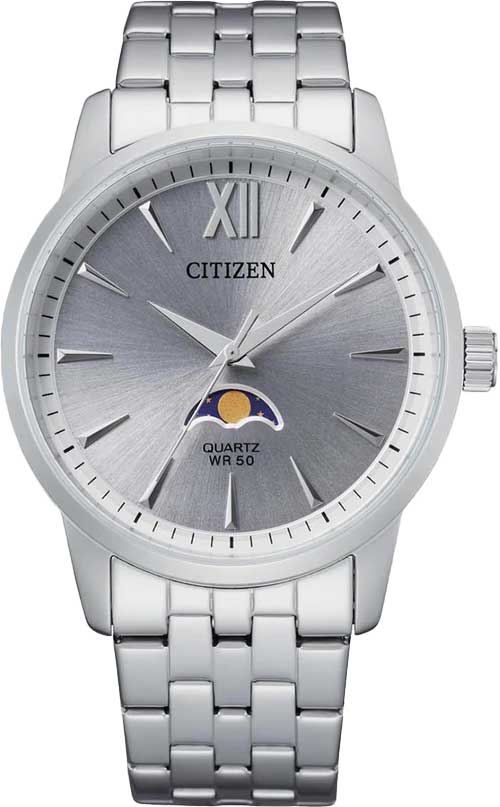 Удобные мужские часы от Citizen отличный вариант для повседневного общения со временем. Basic. Мужские часы с круглым стальным корпусом. Фазы луны отображаются в положении 6 часов. Циферблат с метками в виде штрихов выполнен по технологии Sunray (солнечные лучи). Рифленая заводная головка. Браслет с раскладывающейся застежкой.