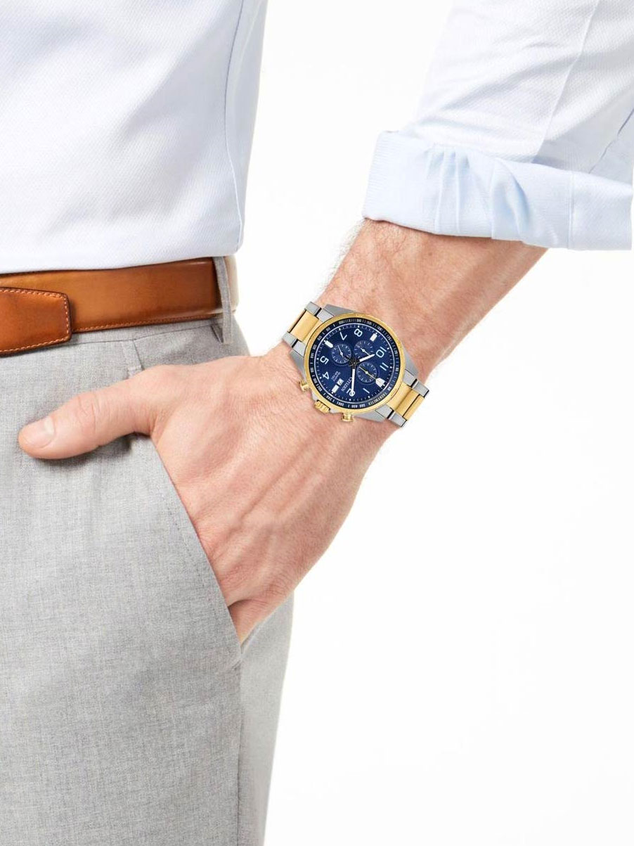 Кварцевые часы не требуют особого ухода и обеспечивают надежное хранение времени. Потребляя мало энергии, они избавляют от необходимости постоянно заводить часы. Basic Chronograph. Мужские наручные часы-хронограф с секундомером и тахиметром. Секундная стрелка вынесена на отдельный циферблат. Функция экономии энергии. Круглый стальной корпус с минеральным стеклом. Рифленый безель. Циферблат выполнен по технологии Sunray (солнечные лучи). Заостренные прямоугольные стрелки в стиле Baton. Метки в виде арабских цифр и штрихов. Метки и стрелки с люминесцентным покрытием, которое светится в темноте после непродолжительной зарядки на свету. Окошко даты находится в положении 3 часа. Рифленая заводная головка с защитой. Завинчивающаяся задняя крышка. Надежный стальной браслет с раскладывающейся застежкой. Время автономной работы элемента питания около 2 лет.
