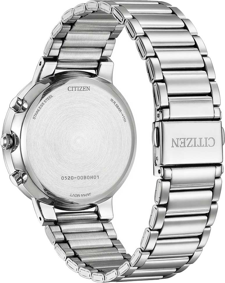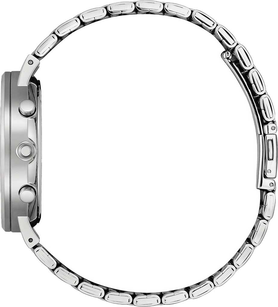 Часы-хронограф с секундомером. Секундомер с точностью показаний 1c и временем измерения 60мин отображается центральной стрелкой. Секундная стрелка вынесена на отдельный циферблат. 12-ти и 24-х часовой формат времени. Циферблат с метками в виде штрихов. Окошко даты находится между часовыми отметками 4 и 5. Браслет с раскладывающейся застежкой.