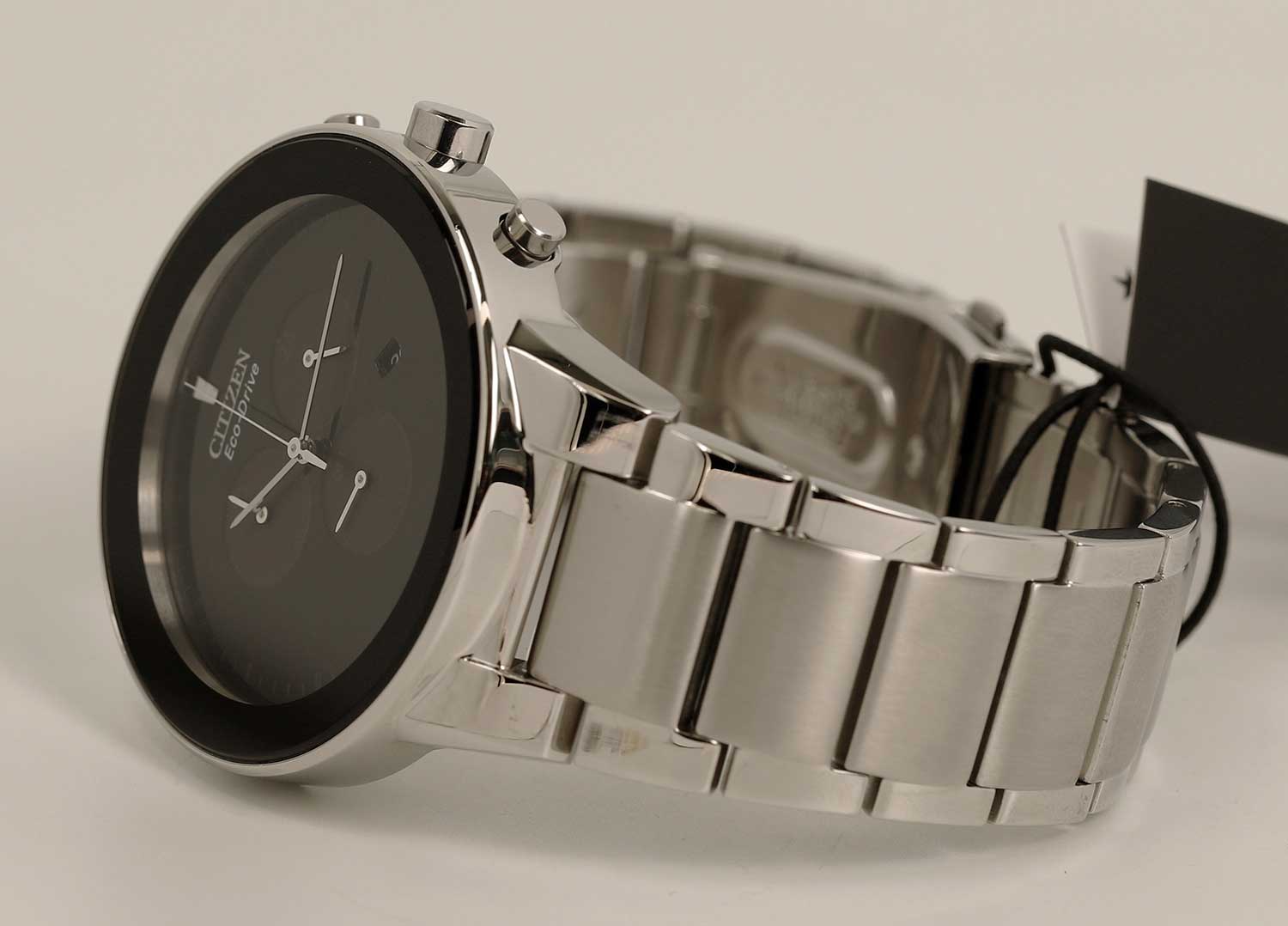Ecо-Drive Axiom. Система Eco-Drive, не требующая замены батарейки. Питание от солнечной энергии, запас энергии на 150 дней. Функция индикации заряда (EOL) и предотвращения перезарядки. Часы-хронограф с секундомером. Секундомер до 1ч, точность 1с. 12-ти и 24-х часовой формат времени. Метки в виде штрихов. Окошко даты находится в положении 4 часа. Браслет с раскладывающейся застежкой.