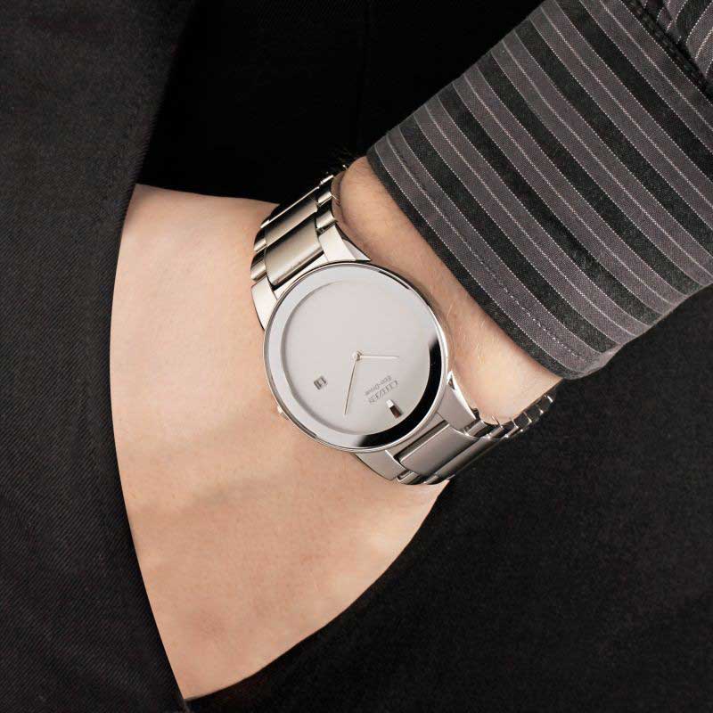 Axiom. Мужские часы. Система Eco-Drive, не требующая замены батарейки. Питание от солнечной энергии, запас энергии на 270 дней. Функция индикации заряда (EOL) и предотвращения перезарядки. Окошко даты. Браслет с раскладывающейся застежкой. Имеется женский вариант модели GA1050-51A.