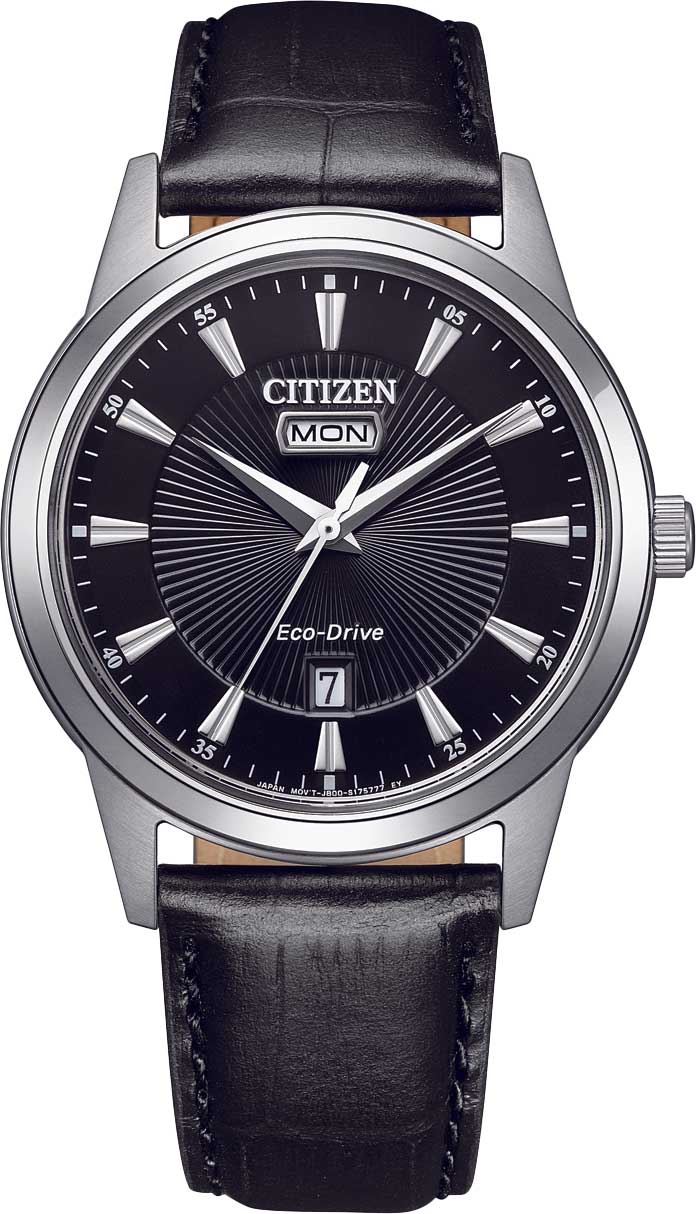 Мужские часы. Система Eco-Drive, не требующая замены батарейки. Питание от солнечной энергии, запас энергии на 240 дней. Функция индикации заряда (EOL) и предотвращения перезарядки. Циферблат с метками в виде штрихов выполнен по технологии Sunray (солнечные лучи). Окошко даты находится в положении 6 часов. Окошко дня недели находится в положении 12 часов. Ремешок с классической застежкой.