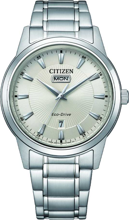 Мужские часы. Система Eco-Drive, не требующая замены батарейки. Питание от солнечной энергии, запас энергии на 240 дней. Функция индикации заряда (EOL) и предотвращения перезарядки. Циферблат с метками в виде штрихов выполнен по технологии Sunray (солнечные лучи). Окошко даты находится в положении 6 часов. Окошко дня недели находится в положении 12 часов. Браслет с раскладывающейся застежкой.