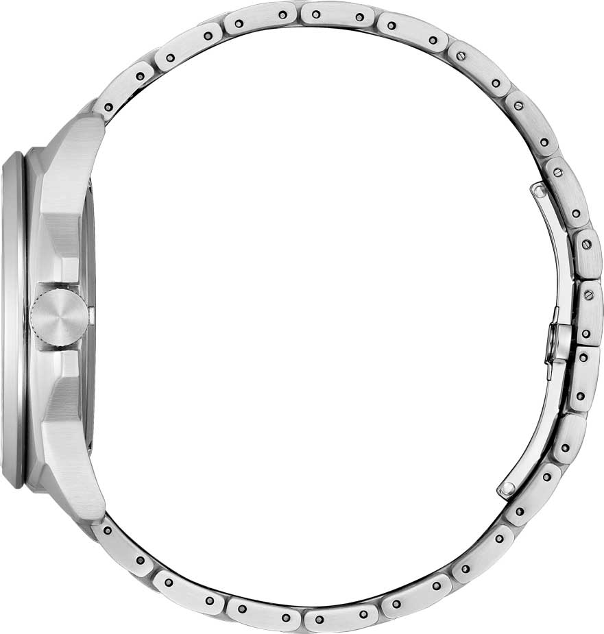 Система Eco-Drive, не требующая замены батарейки. Питание от солнечной энергии, запас энергии на 240 дней. Функция индикации заряда (EOL) и предотвращения перезарядки. Циферблат с метками в виде штрихов и двух арабских цифр. Окошко даты находится в положении 3 часа. Рифленая заводная головка с защитой. Браслет с раскладывающейся застежкой.
