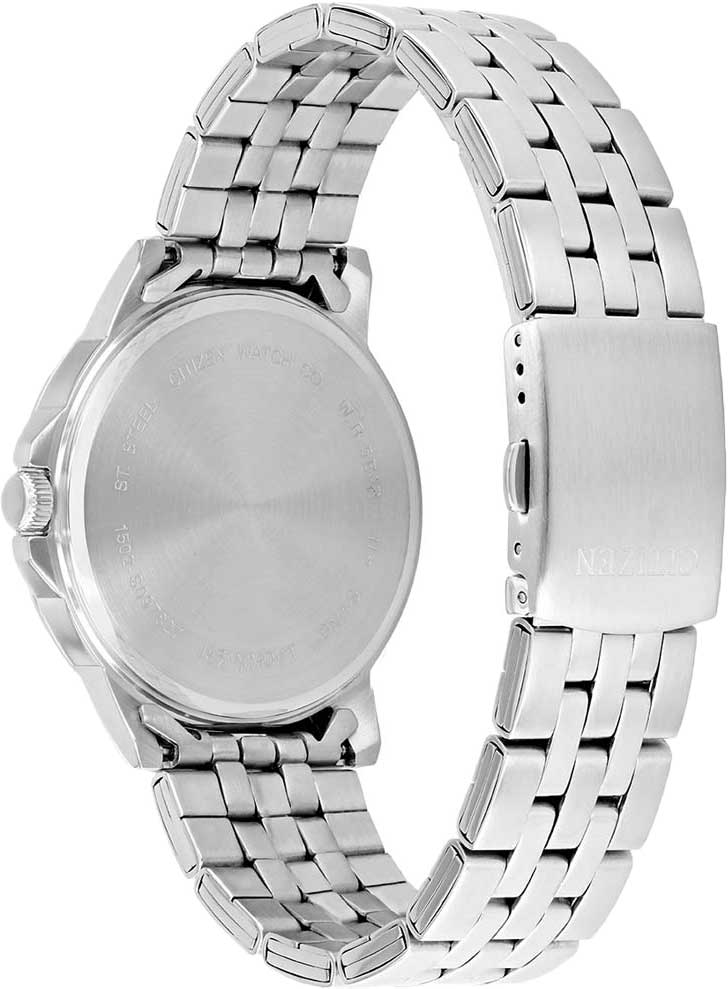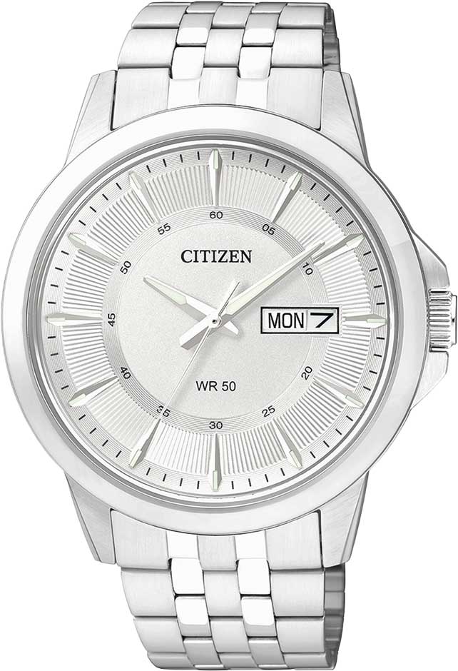 Мужские часы с круглым стальным корпусом. Циферблат с метками в виде штрихов. Окошко даты и дня недели находится в положении 3 часа. Рифленая заводная головка с защитой. Браслет с раскладывающейся застежкой.