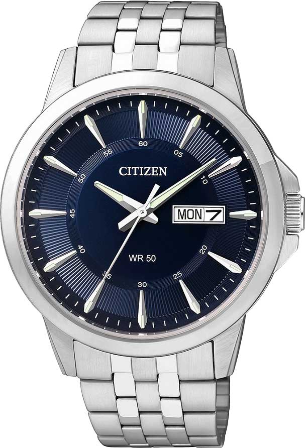 Мужские часы с круглым стальным корпусом. Циферблат с метками в виде штрихов. Окошко даты и дня недели находится в положении 3 часа. Рифленая заводная головка с защитой. Браслет с раскладывающейся застежкой.