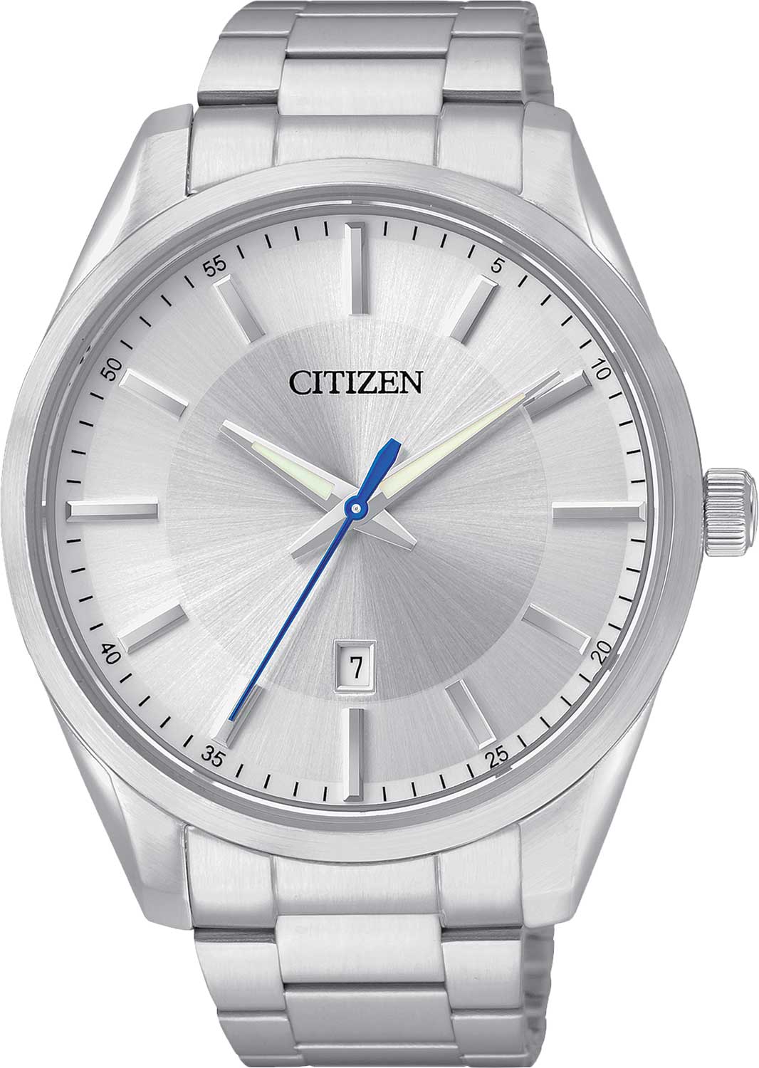 Мужские часы с круглым стальным корпусом. Циферблат с метками в виде штрихов выполнен по технологии Sunray (солнечные лучи). Окошко даты находится в положении 6 часов. Стальной браслет с раскладывающейся застежкой.