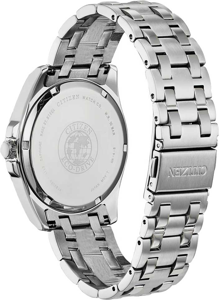 Циферблат выполнен по технологии Sunray (солнечные лучи) и защищен прочным сапфировым стеклом. Метки в виде штрихов и точек, инкрустированных кристаллами. Заводная головка с защитой. Браслет с раскладывающейся застежкой.
