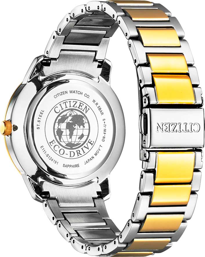 Перламутровый циферблат с метками в виде штрихов защищен прочным сапфировым стеклом. Окошко даты находится в положении 3 часа. Браслет с раскладывающейся застежкой. Имеется женский вариант модели EW2594-84Y.
