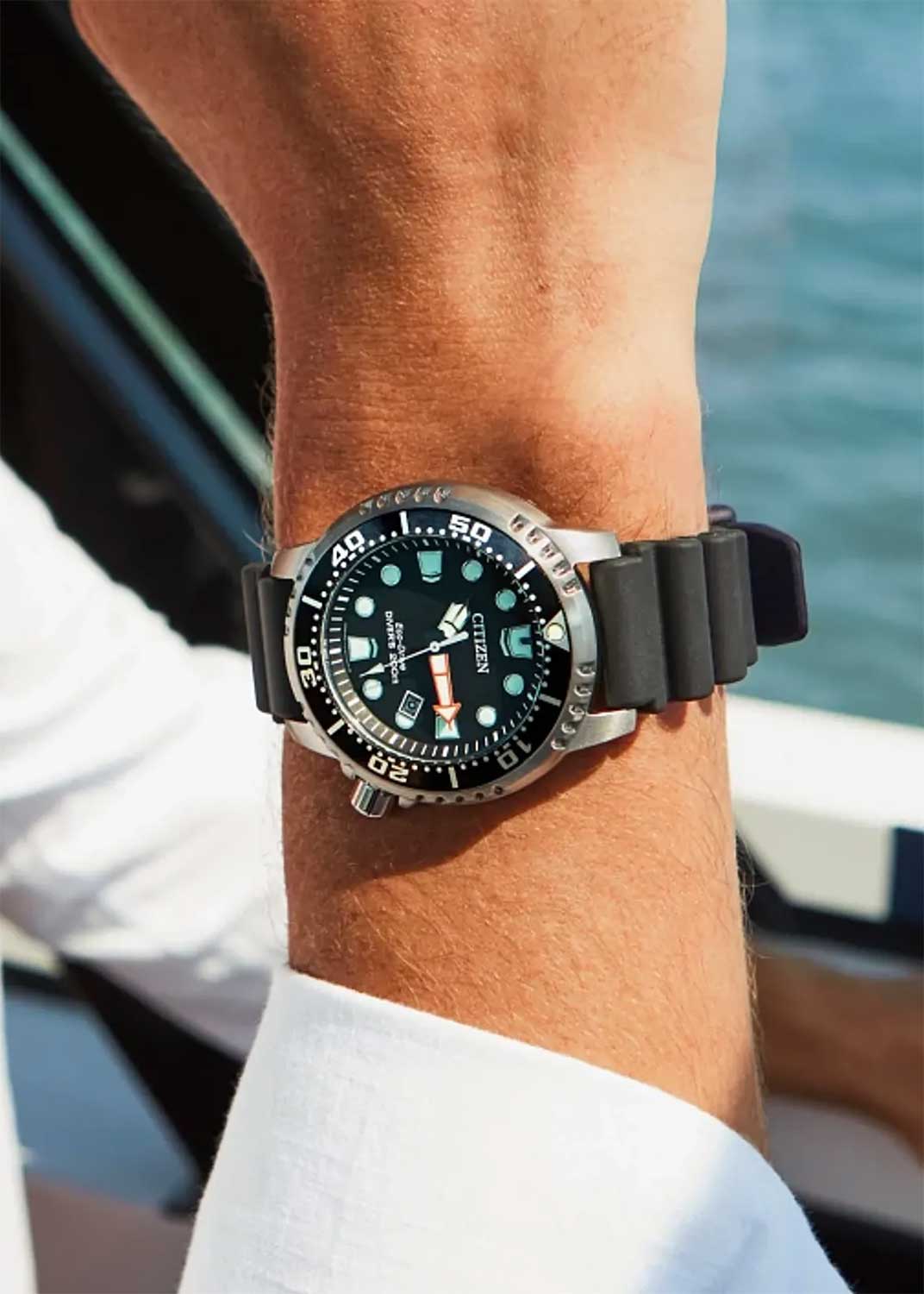 Promaster Dive. Сертифицированные часы для дайвинга (ISO 6425). Система Eco-Drive, не требующая замены батарейки. Питание от солнечной энергии, запас энергии на 180 дней. Функция индикации заряда (EOL) и предотвращения перезарядки. Защищены от магнитных полей.