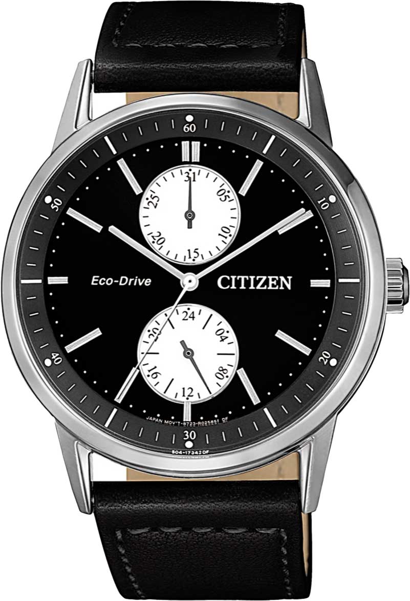 Мужские часы. Система Eco-Drive, не требующая замены батарейки. Питание от солнечной энергии, запас энергии на 180 дней. Функция индикации заряда (EOL) и предотвращения перезарядки. 12-ти и 24-х часовой формат времени. Циферблат с метками в виде штрихов. Рифленая заводная головка. Ремешок с классической застежкой.