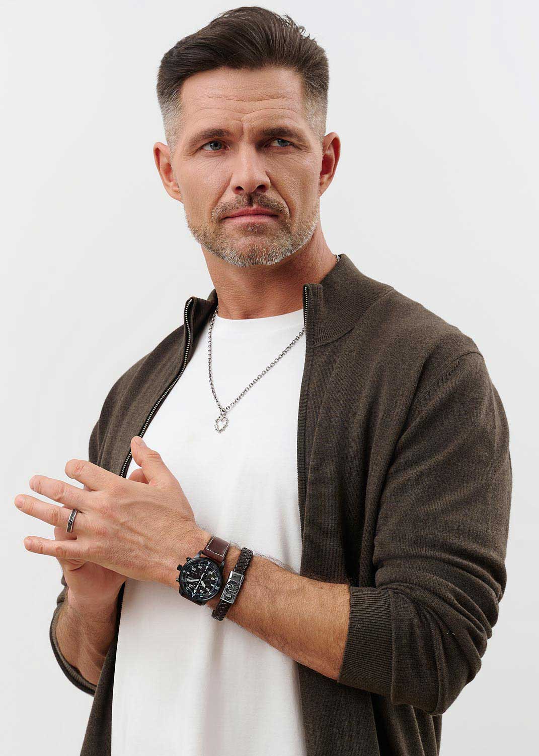 Часы-хронограф с секундомером. Секундомер с точностью показаний 1/5c и временем измерения 1ч. 12-ти и 24-х часовой формат времени. Метки в виде штрихов и арабских цифр. Окошко даты находится в положении 3 часа. Завинчивающаяся задняя крышка. Ремешок с классической застежкой.