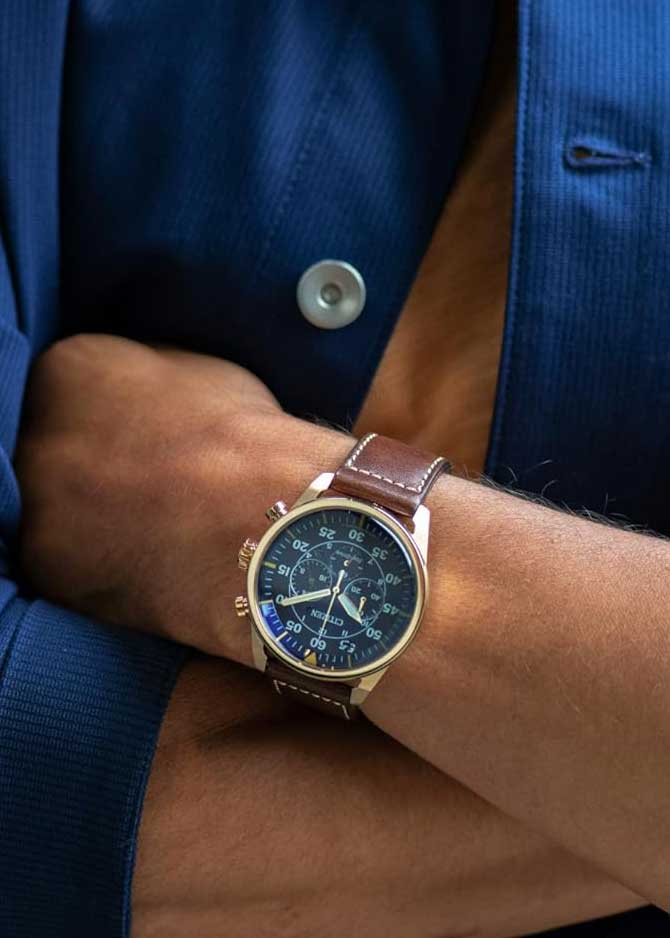 Часы-хронограф с секундомером. Секундомер с точностью 1/5сек и временем измерения 1ч. 12-ти и 24-х часовой формат времени. Секундная стрелка вынесена на отдельный циферблат.